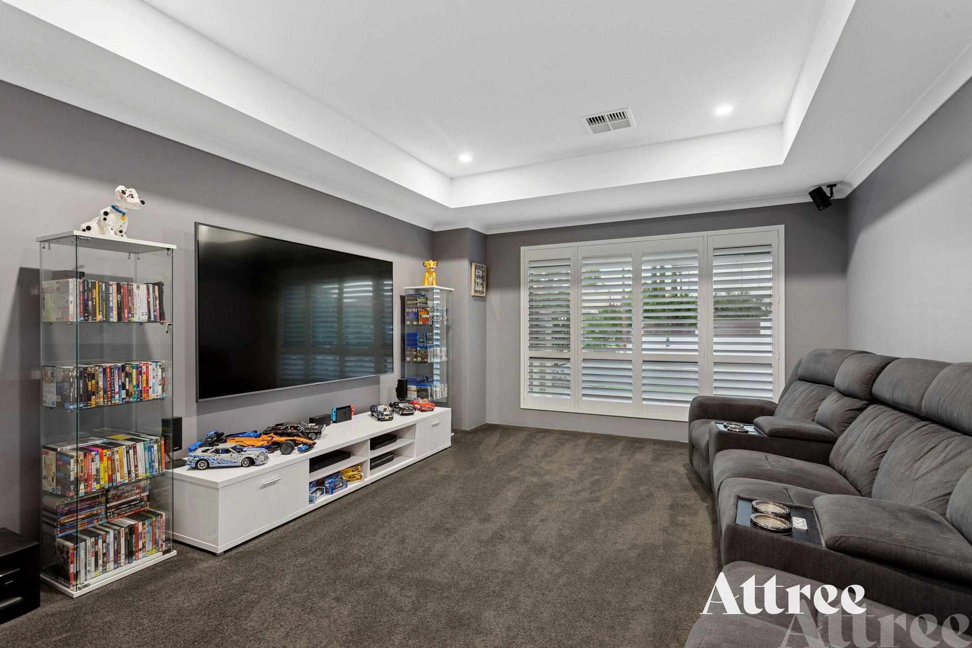 The impressive interior begins with a grand double-door entry and continues with ducted reverse-cycle air conditioning throughout, complemented by a 6.5kW solar panel system for year-round energy efficiency. A massive theatre room with bulkhead ceilings provides the perfect movie night retreat, while the expansive open-plan main living area features tiled flooring and plantation shutters to the living area windows, adding both style and privacy.