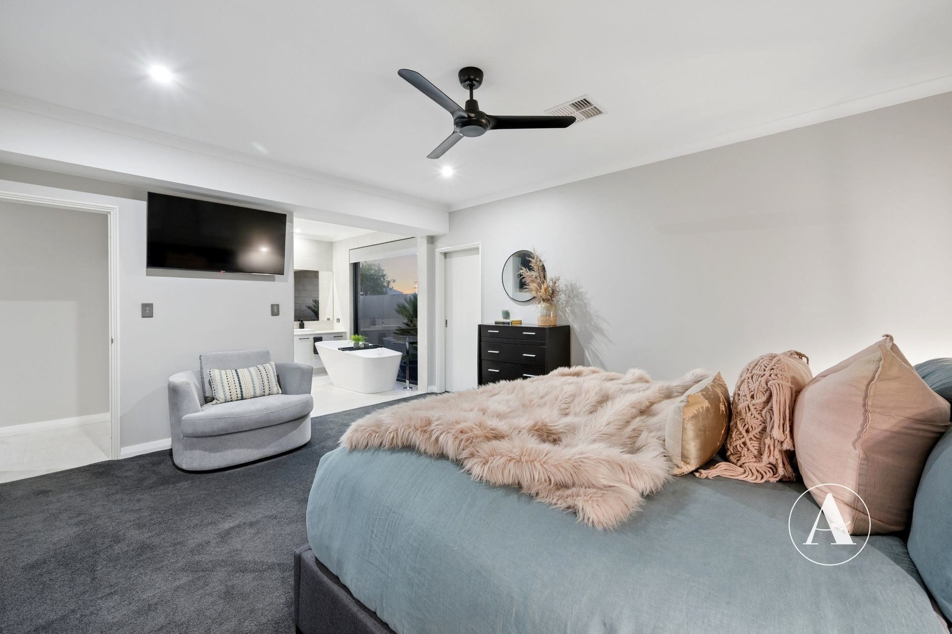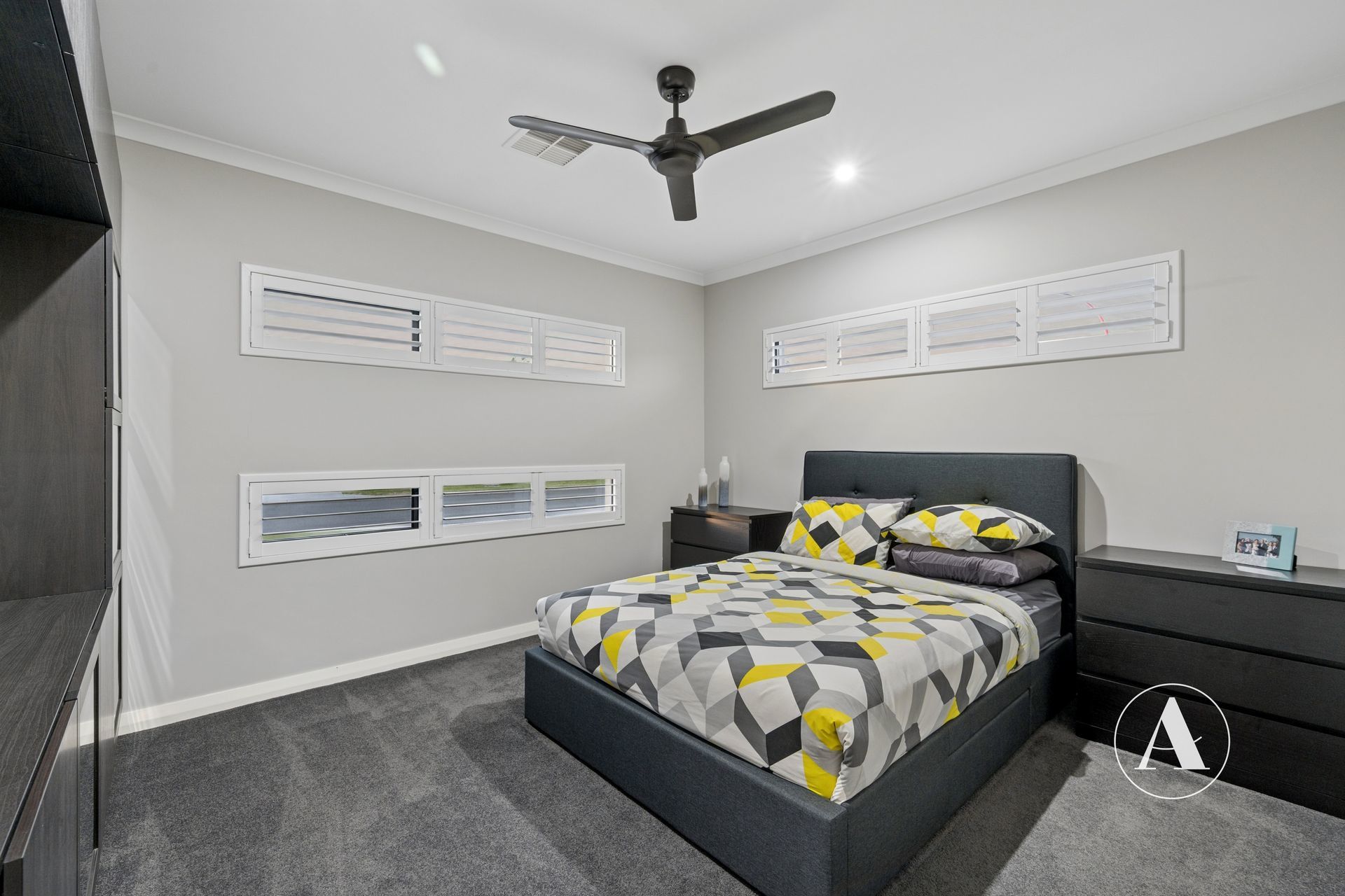 • The home’s secondary bedrooms are all generously sized. Bedrooms 2 and 3 each feature fitted walk-in robes, plantation shutters, ceiling fans, and TV points. Bedroom 4, also perfect as a study, includes a built-in robe with mirrored sliders and plantation shutters.