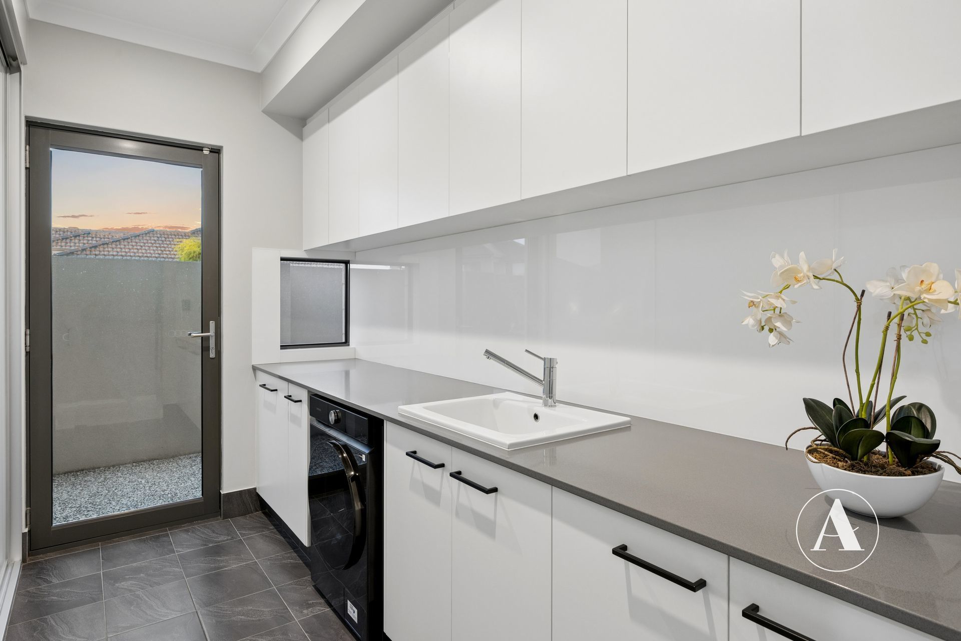 • The laundry has been thoughtfully designed to provide extra space and functionality, complete with a glass entry door, overhead cupboards, stone benchtops and a triple linen cupboard with glass sliding doors.