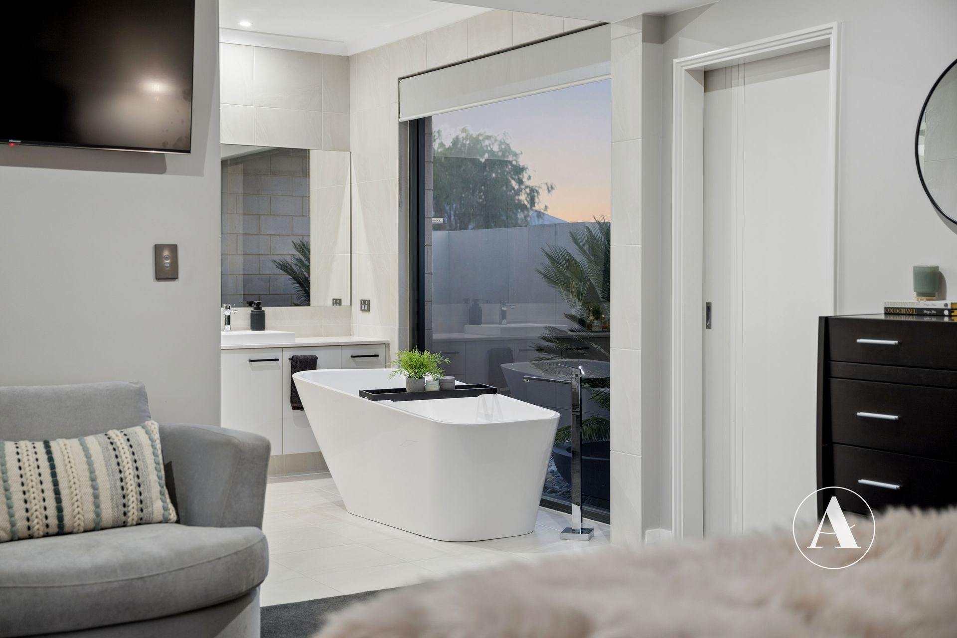 • Open style ensuite showcases a feature glass window to the garden, full-height tiling, a freestanding bath, large double stone vanity, a sleek hobless shower and a separate toilet finished with a glass door.