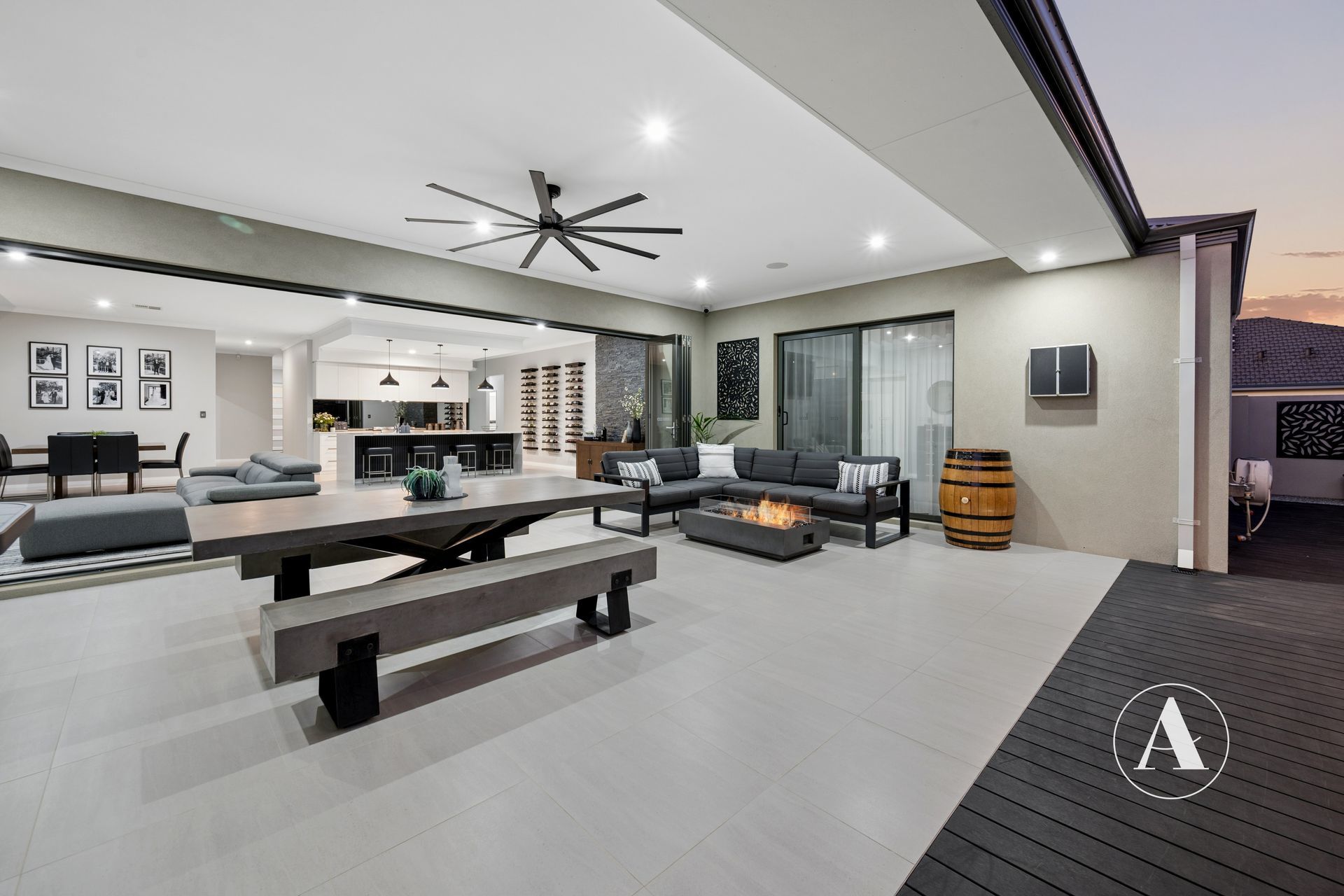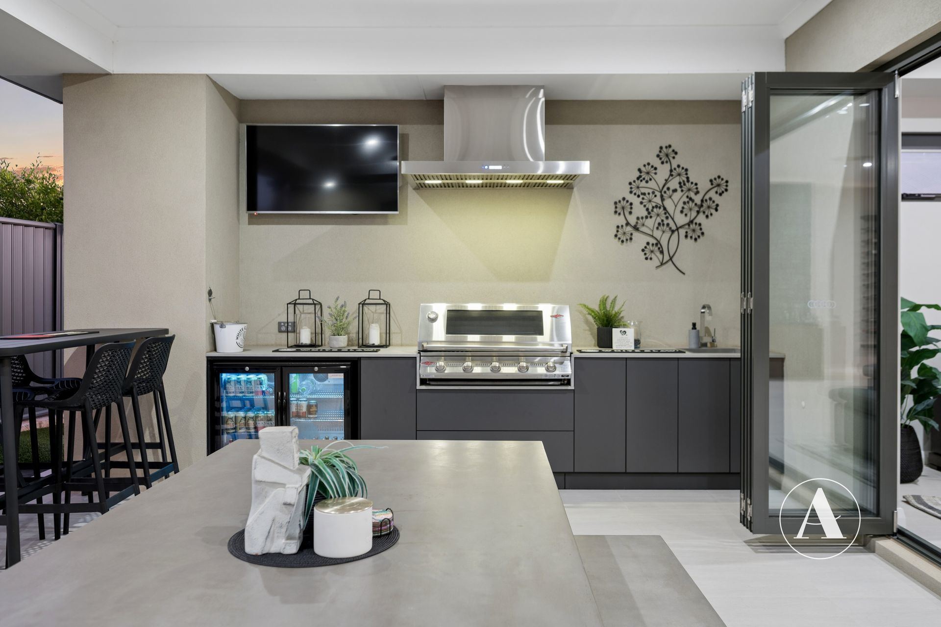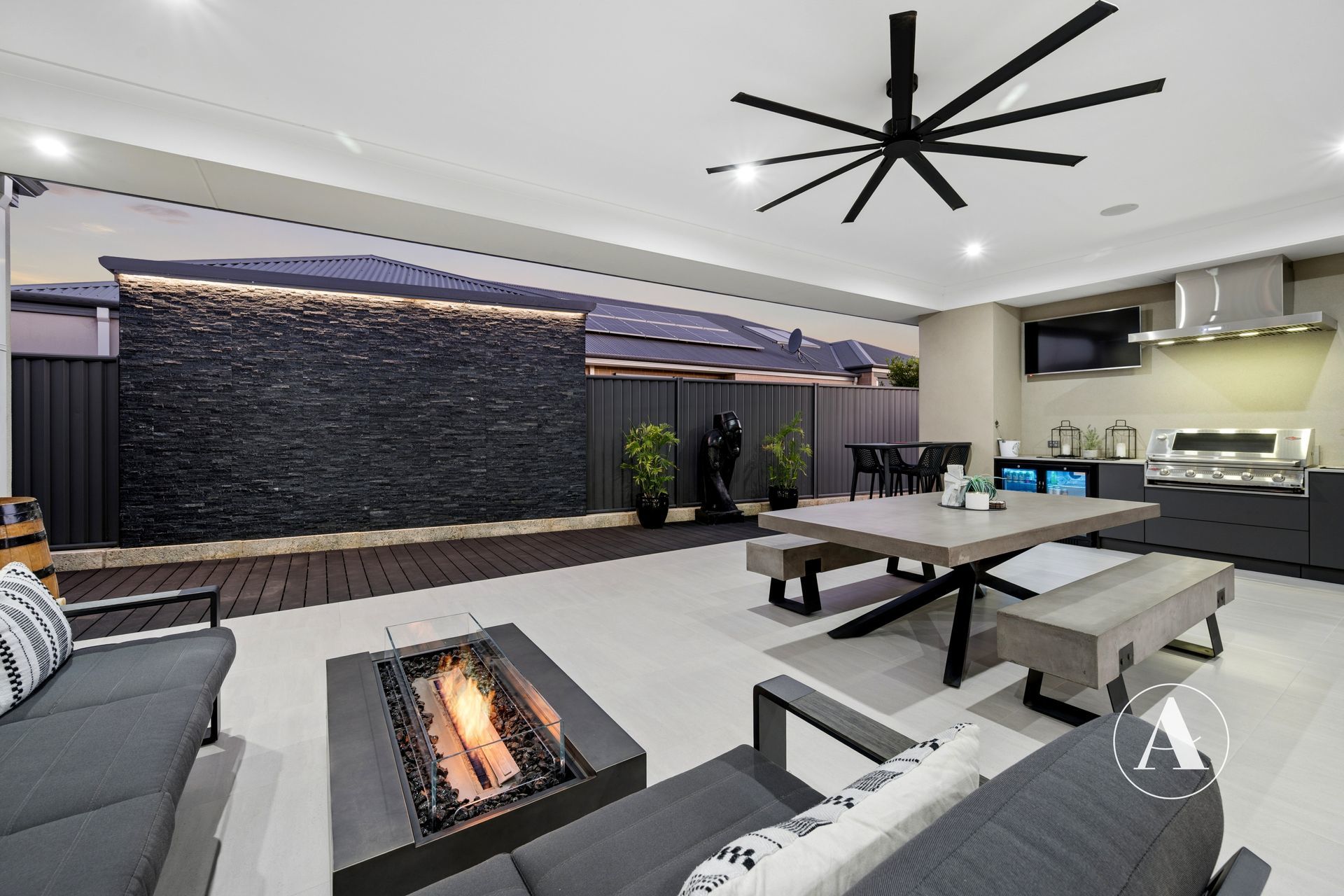 • Expansive 8-meter bi-fold doors open onto a generous alfresco area, complete with a built-in BBQ, rangehood, sink, ceiling-mounted speakers, large ceiling fan, and a black-clad feature wall.