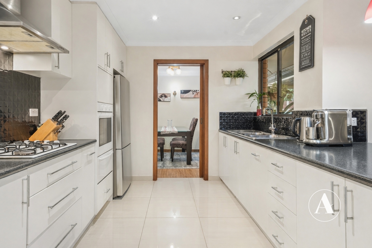 • Combining functionality and modern design, the kitchen includes plenty of bench space, overhead cupboards, built in pantry all finished with stainless appliances including gas cooktop.