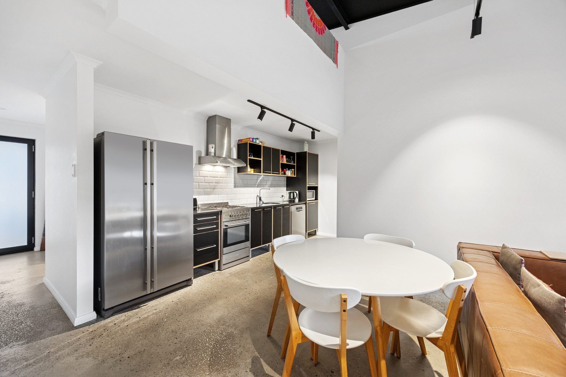 • As you step through the front door, you’re welcomed by a wide entry hallway, polished concrete floors, and expansive high ceilings, creating a warm and inviting atmosphere that flows throughout the home.