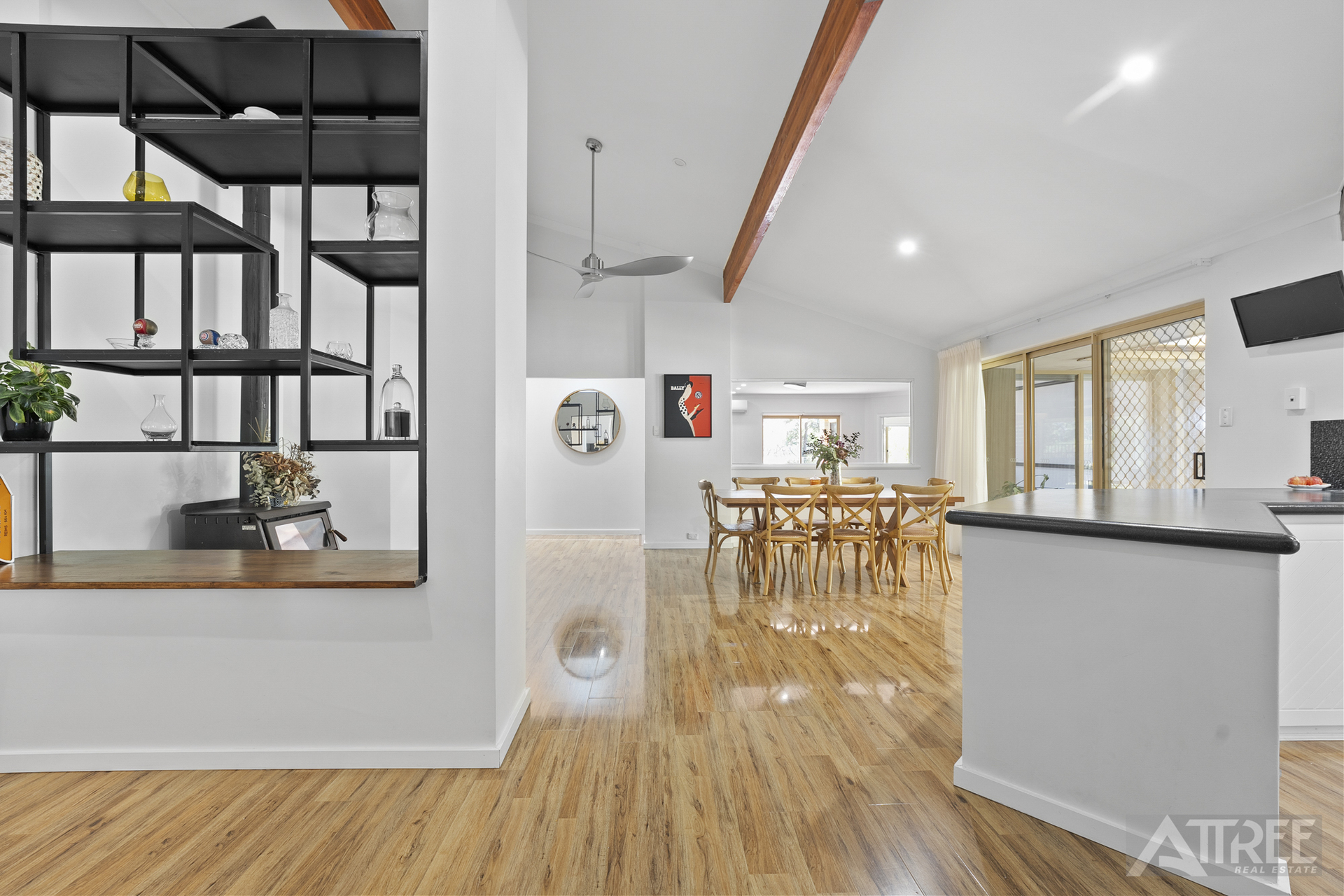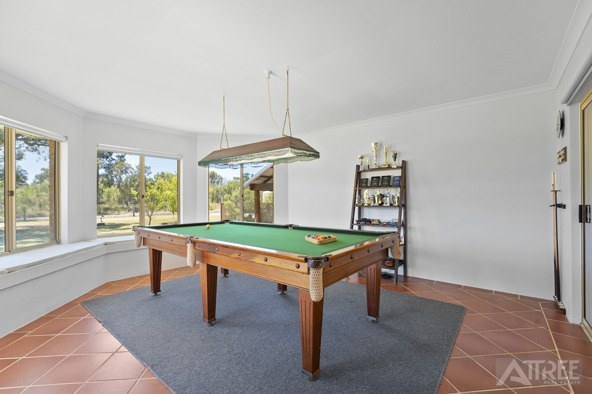 From the moment you step through the front door, the home welcomes you with warmth and contemporary flair. Wooden-look flooring, open-plan living zones and thoughtful design ensure space for every stage of family life. Front sunken living is carpeted offering a secondary lounge with split system air conditioning. The central open living showcases a sparkling kitchen with stainless steel appliances including double sink, oven, gas stove and rangehood. The built in pantry, shoppers entry and fridge recess with plumbing offers great accessibility and is complimented by over head and below bench cabinetry. Artistic design and raked ceilings in the dining, featuring timber beams creates a spacious ambience, and warmth with wood fireplace. Continue your indoor entertaining in the tiled theatre and games room. The perfect afternoon wind down and weekend wind up. Bar, LED downlights and pool table room with window seating/storage ticks the boxes for the sporting highlights of the year, and doubles as a great flow to the outdoor entertaining zone, through sliding doors.