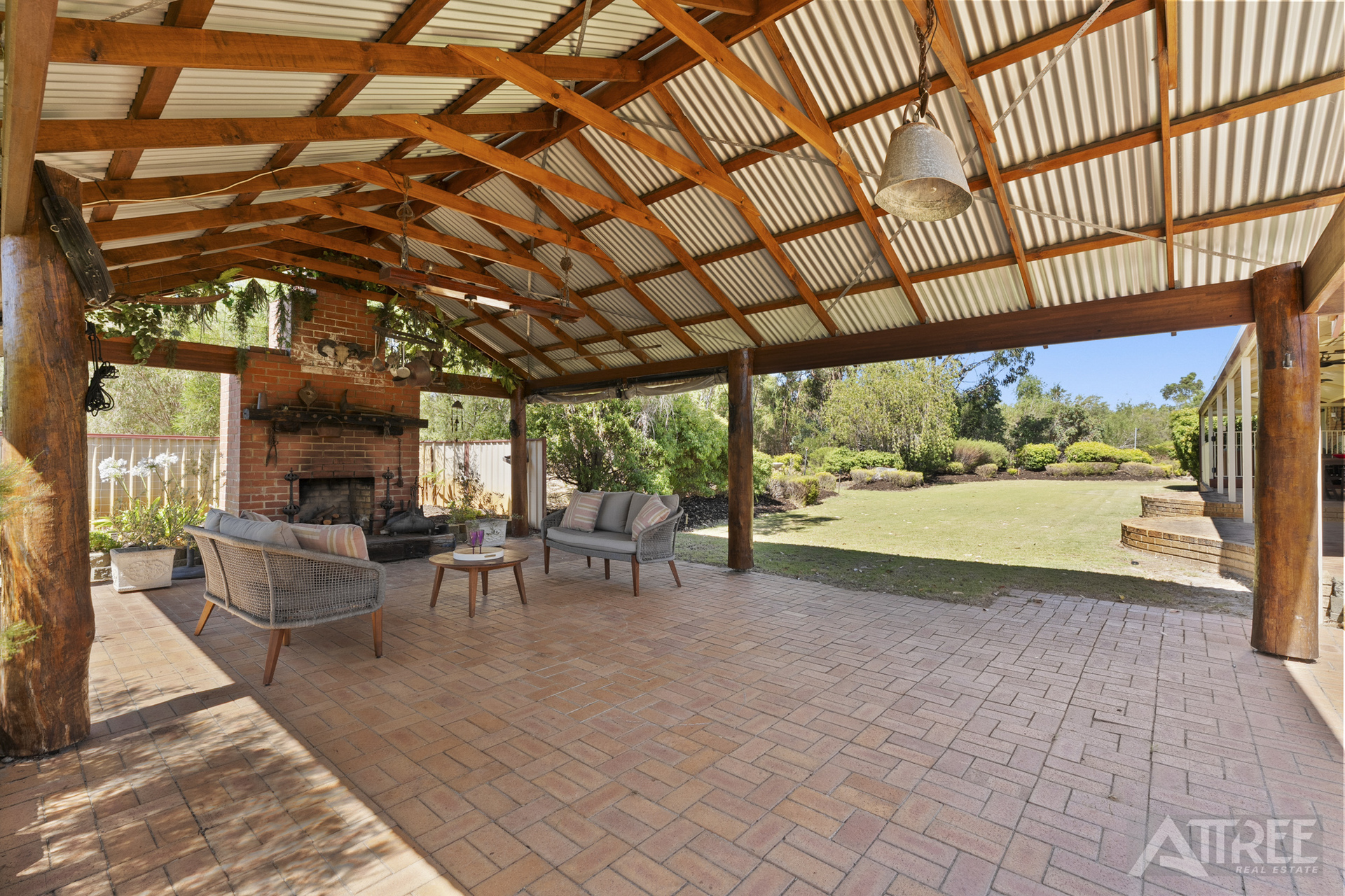 Still enjoy being in the outdoors in the cooler months? The outdoor fireplace and gable patio area makes this spot one to use all year round. Rustic charm and panoramic views of luscious lawn and tall trees will complete the serenity for whichever month you’re in.
