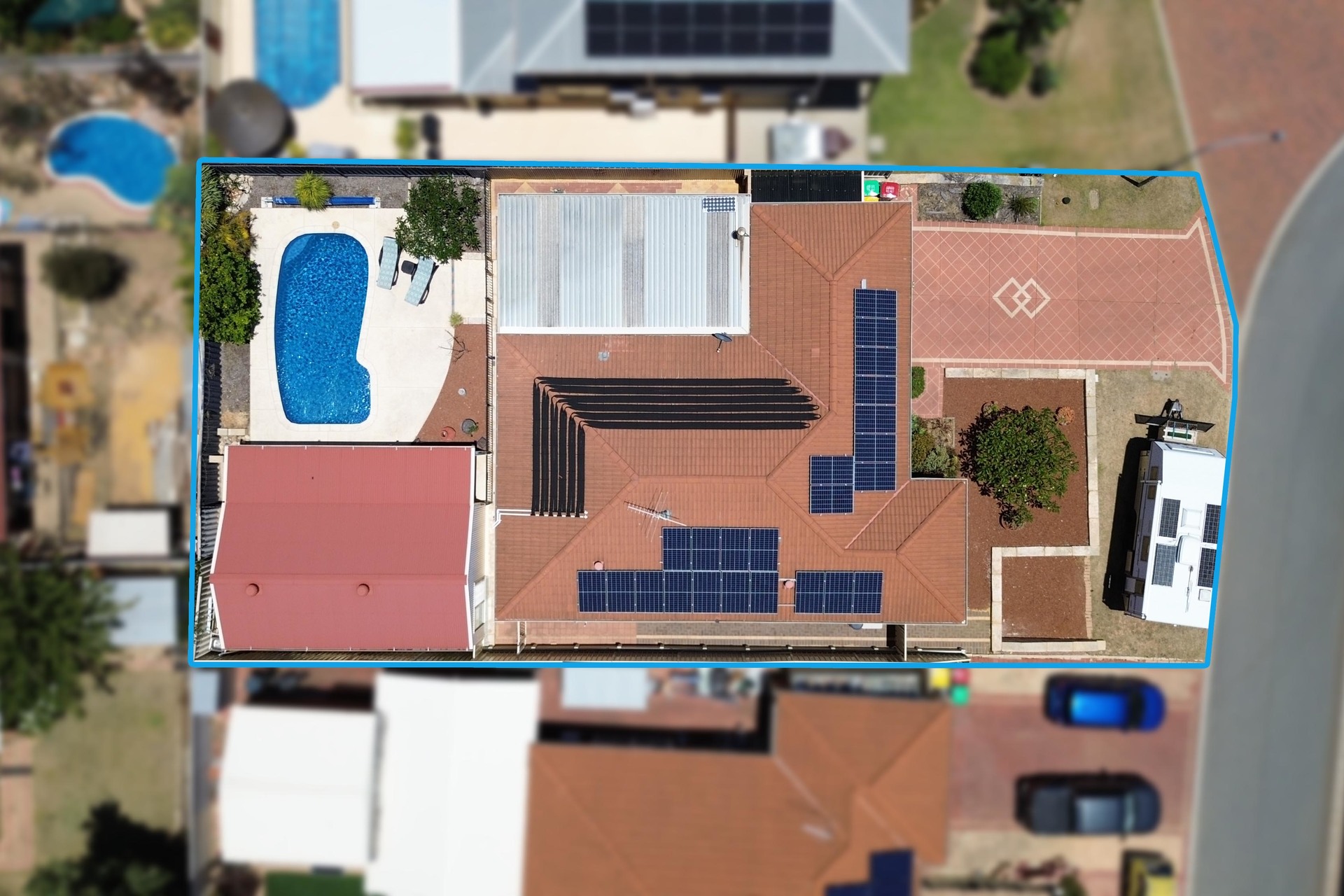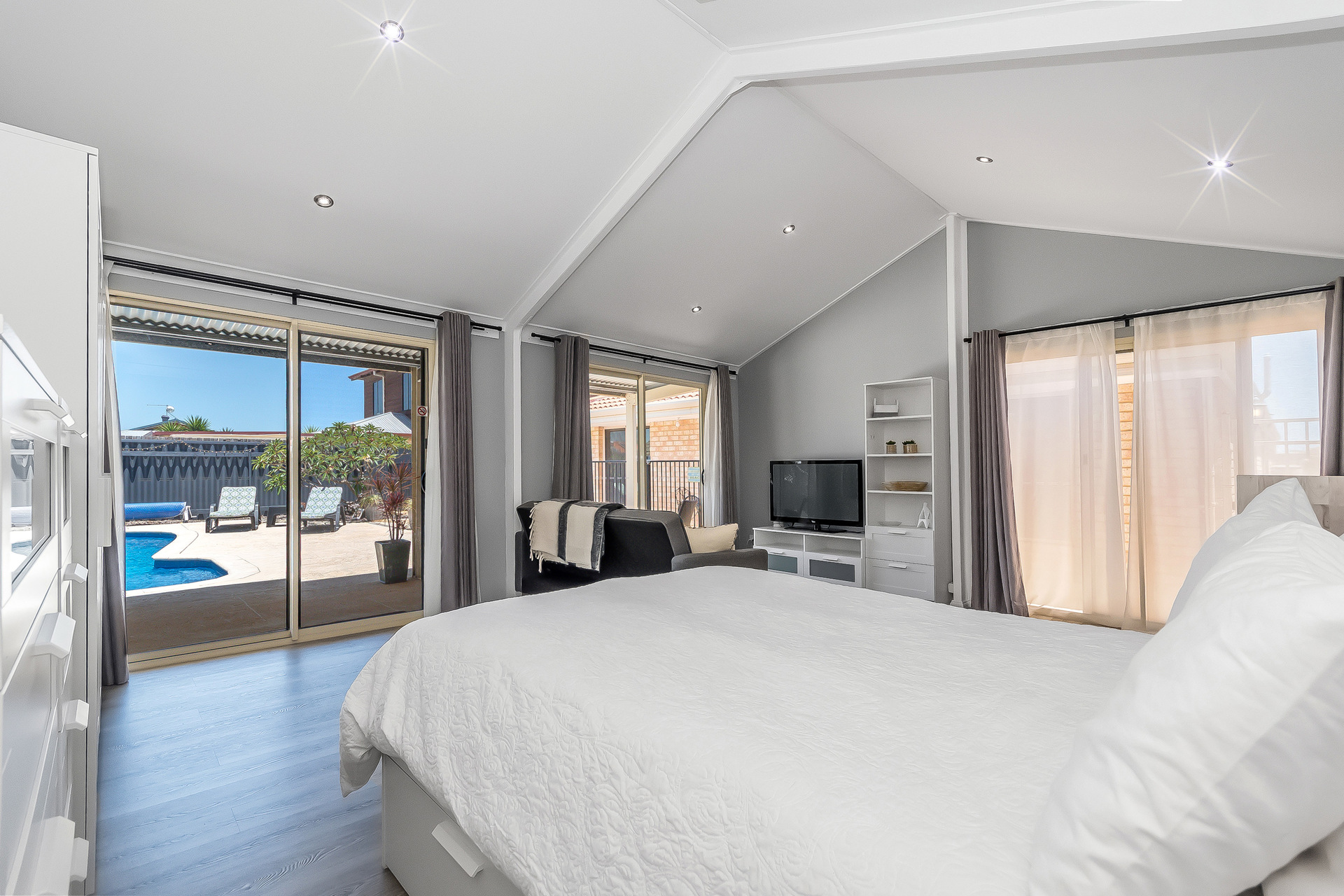 Heading to the right, you’re drawn outdoors to the huge patio entertainment area. This space is designed for big families, big events, and big summers. Custom garage doors allow the workshop/garage to fully open to the patio, offering an impressive extension of the entertaining zone, perfect for birthdays, holiday gatherings or warm summer nights with friends. The garage also includes a well-appointed workbench and an additional secure storage room along the fence line.