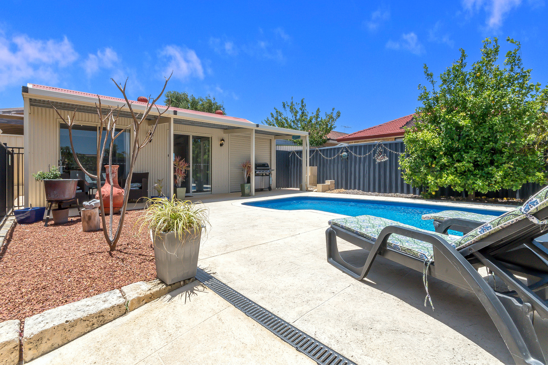 At the far end, the patio steps up to the stunning elevated below-ground pool. Sparkling, bright and beautifully finished, this summer oasis catches the light across its crystal-clear water. There’s plenty of surrounding space for lounges, gazebos, or any resort-style additions you can imagine, a dream setup for families who love to spend their summers outdoors.