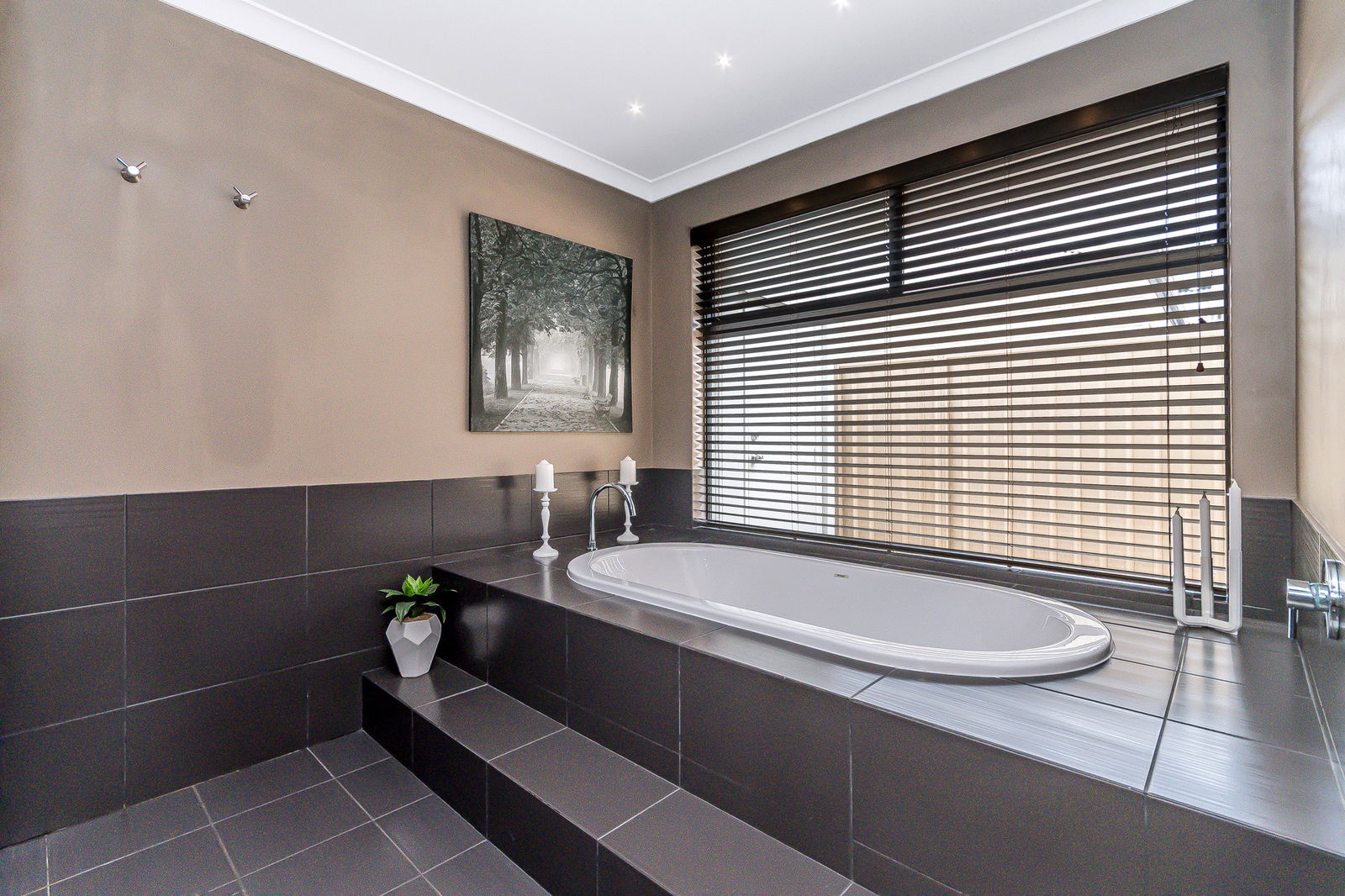 The master suite feels more like a retreat than a bedroom, with high recessed ceilings, feature lighting, and soft sheers framing a private glass door that opens to the garden. A fully fitted walk-in robe offers exceptional storage, while the ensuite is pure indulgence – featuring twin floating vanities, a spacious walk-in shower with dual showerheads, and a large sunken bathtub that invites relaxation at the end of a long day.