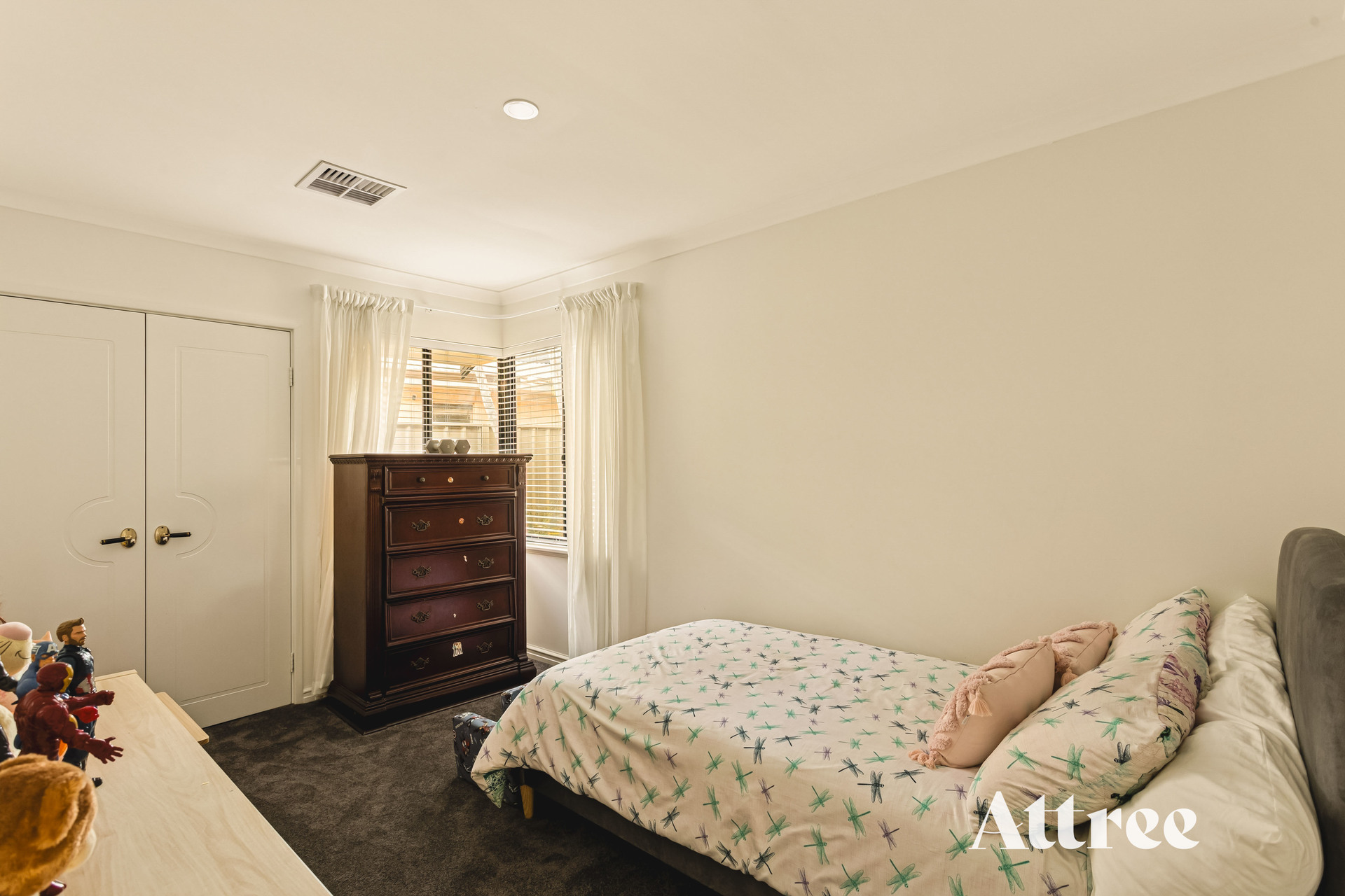 Moving into the family wing, discover intelligent design, including under-stair storage and two separate linen closets. The lower floor bedroom wing ensures privacy, with Bedroom 4 perfect for those needing peace from the rising sun. The well-appointed laundry leads to a separate toilet and the main bathroom, which, like the ensuite, features designer tiling, in-built ledges, and a bath for ultimate relaxation. Bedroom 3 enjoys direct bathroom access (creating a potential ground-floor suite) and, along with Bedroom 2, boasts beautiful views over the rear lawns, pool, and lake.