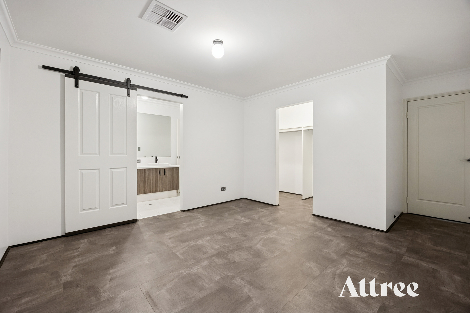 • Tucked away at the rear of the home, the master suite offers a walk-in robe and direct access to the backyard. Stylish barn door leads into the ensuite with double vanities and matte black finishes.