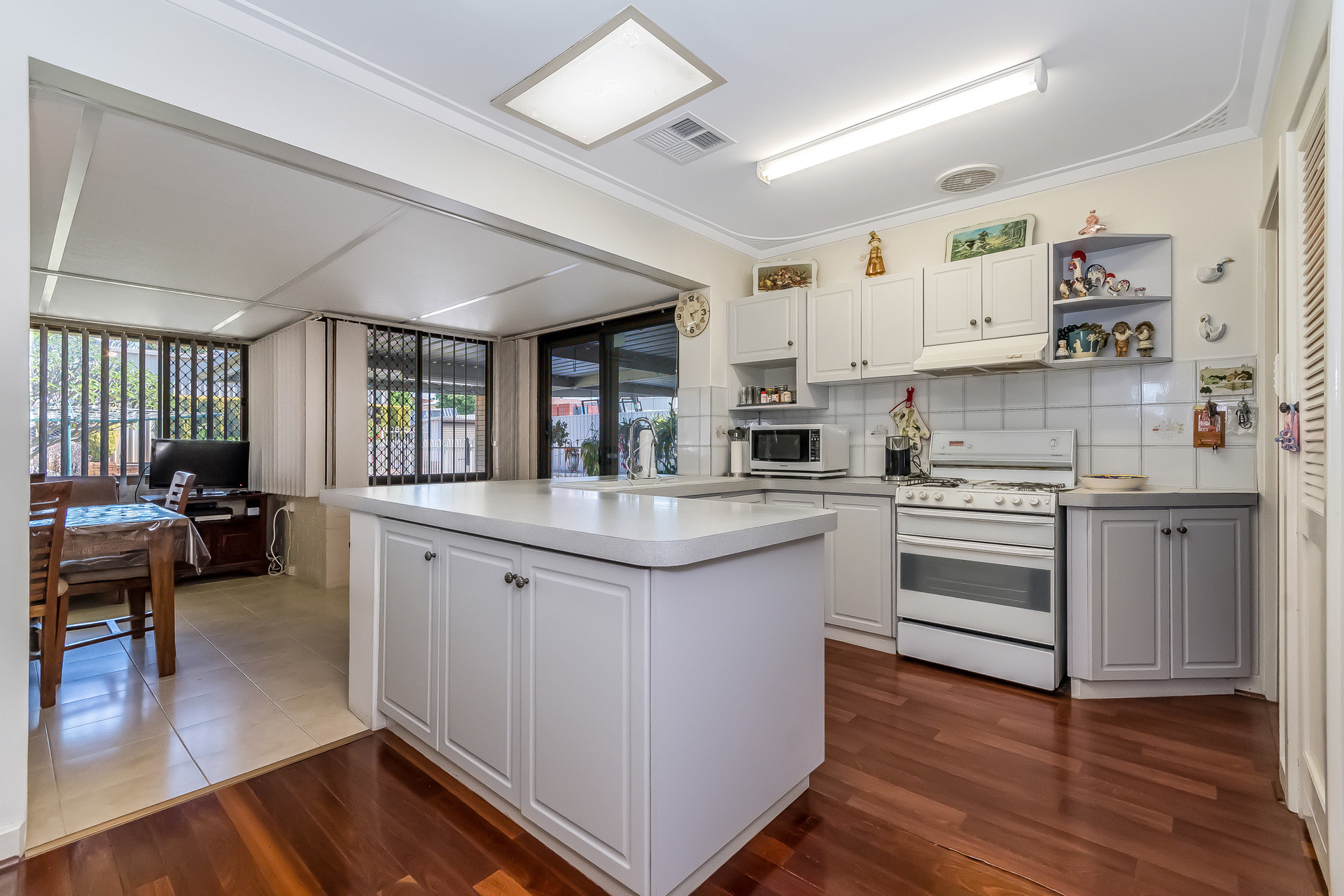 The floor plan flows into a generous family and dining room overlooking the lush, meticulously kept backyard. Here, mature gardens frame the large below-ground pool and a welcoming outdoor entertaining area, the perfect space for summer gatherings.