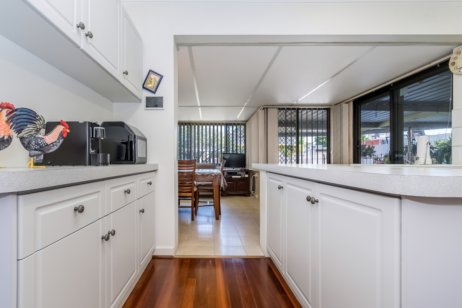 The interior has been thoughtfully updated without losing its heritage appeal. Plantation shutters, new security screens, and an impressively maintained chef’s kitchen blend seamlessly with the home’s original features. The main bedroom suite includes a step-down sitting area and private ensuite, a truly unique design detail that instantly elevates the space.