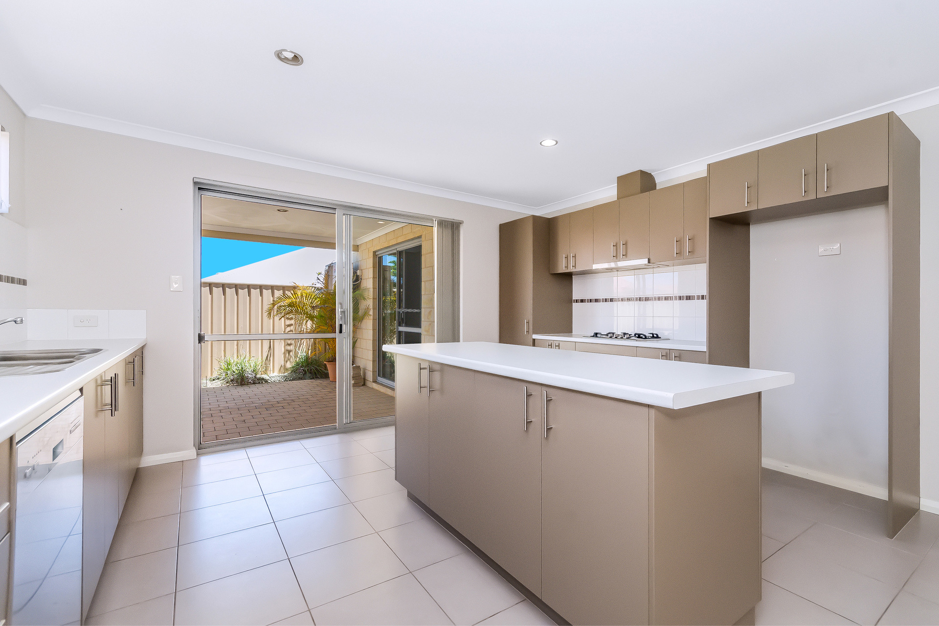 The kitchen is well-equipped with an island bench, dishwasher, double sink, tiled splashback, Arda oven, 4-burner gas cooktop, and rangehood. With ample under-bench cabinetry, a fridge recess, and sliding door access to the backyard, it’s designed for practicality and everyday ease.