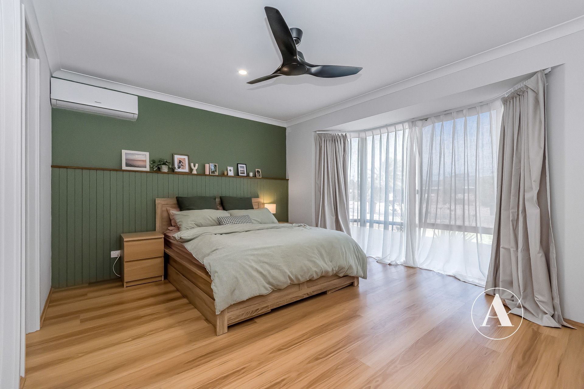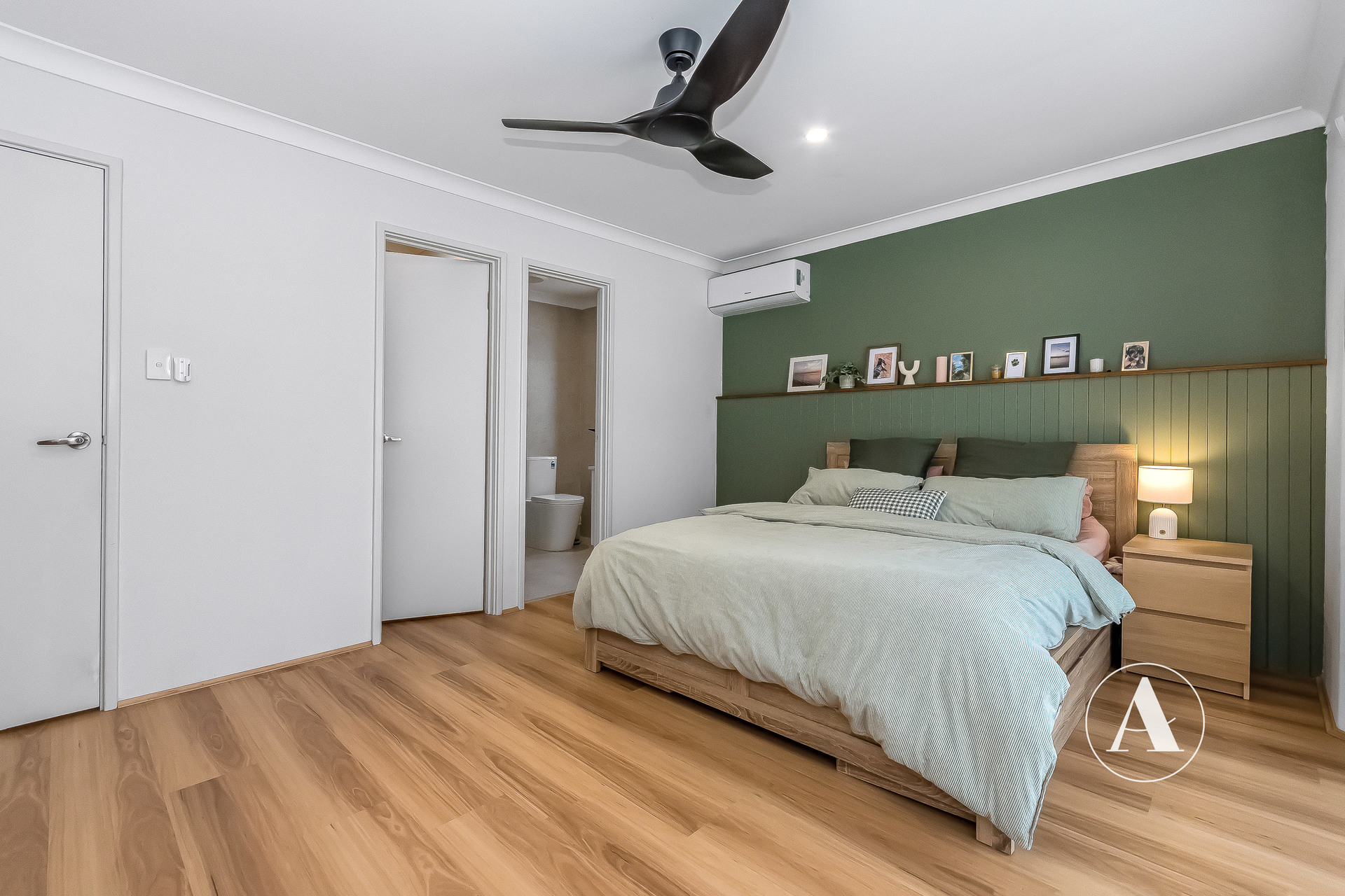 As you enter the home you are welcomed through a single wooden entry door with a security screen, stepping onto warm wood flooring that flows throughout much of the home and sets a stylish tone from the outset. The king-sized master bedroom is positioned privately and features wood flooring, a striking feature wall, downlights, ceiling fan, sheers and curtains, along with a Hisense split system for year-round comfort. A walk-in robe provides excellent storage, while the modern ensuite is finished with floor-to-ceiling tiles, a single vanity with mirror, glass shower screen, contemporary tapware, downlights, exhaust fan and WC.