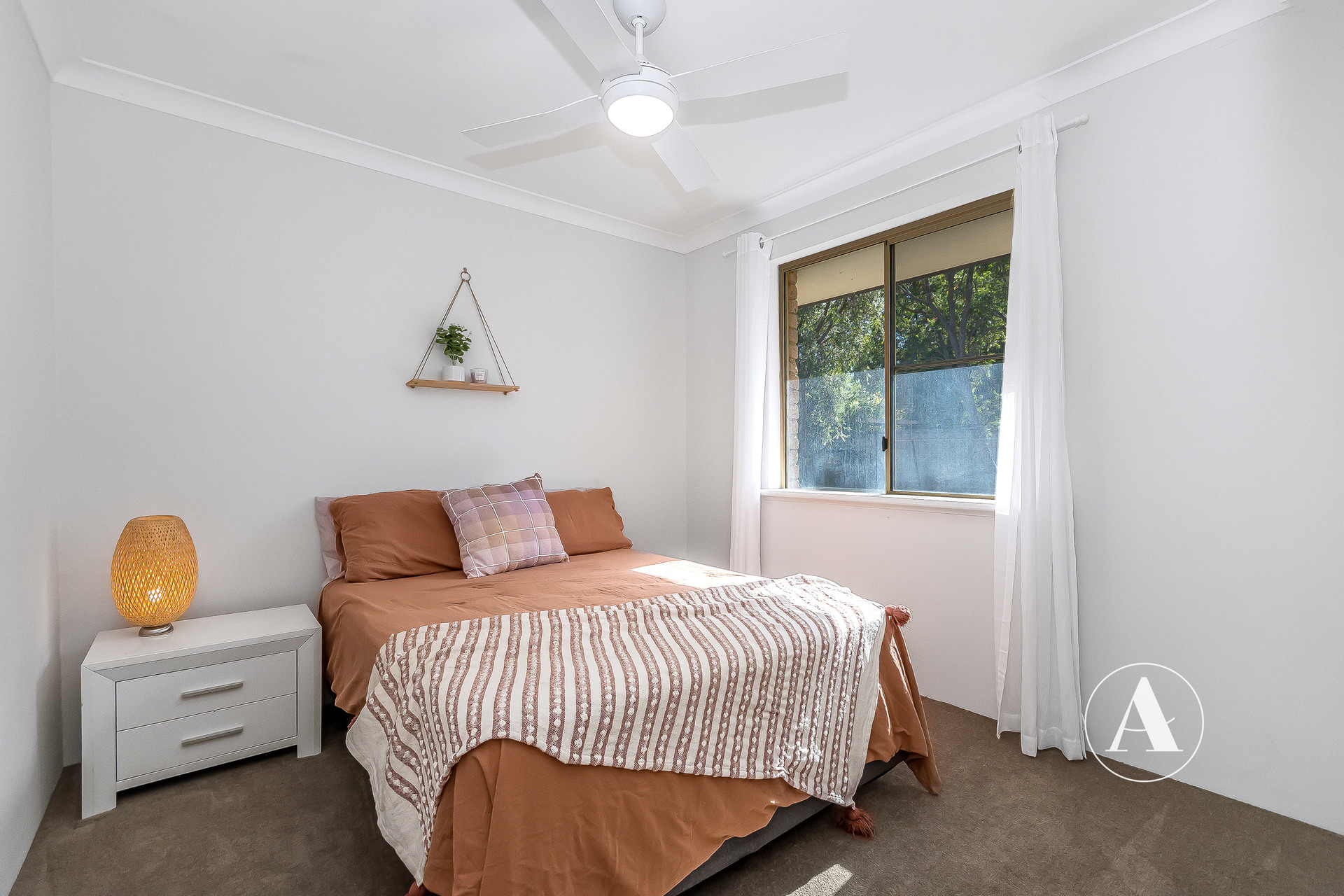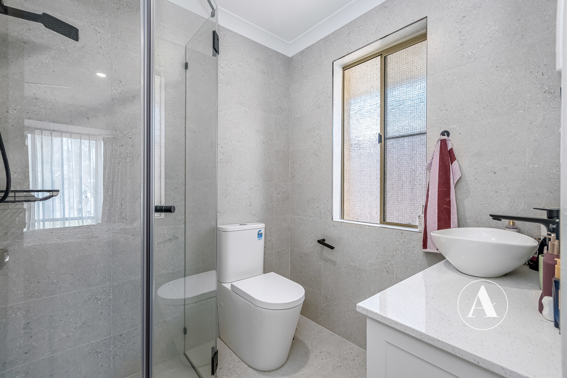 The remaining bedrooms are well sized and thoughtfully finished. One bedroom includes wood flooring, downlights, a ceiling fan with light and a double mirrored sliding robe, while the other two bedrooms are fitted with carpet, ceiling fans with lights, sheer curtains and double mirrored robes. The main bathroom continues the modern theme with floor-to-ceiling tiling, a single vanity with under-cupboards, mirror, glass shower screen, modern tapware, linen storage, exhaust fan and heat lamp, with a separate WC for added convenience.