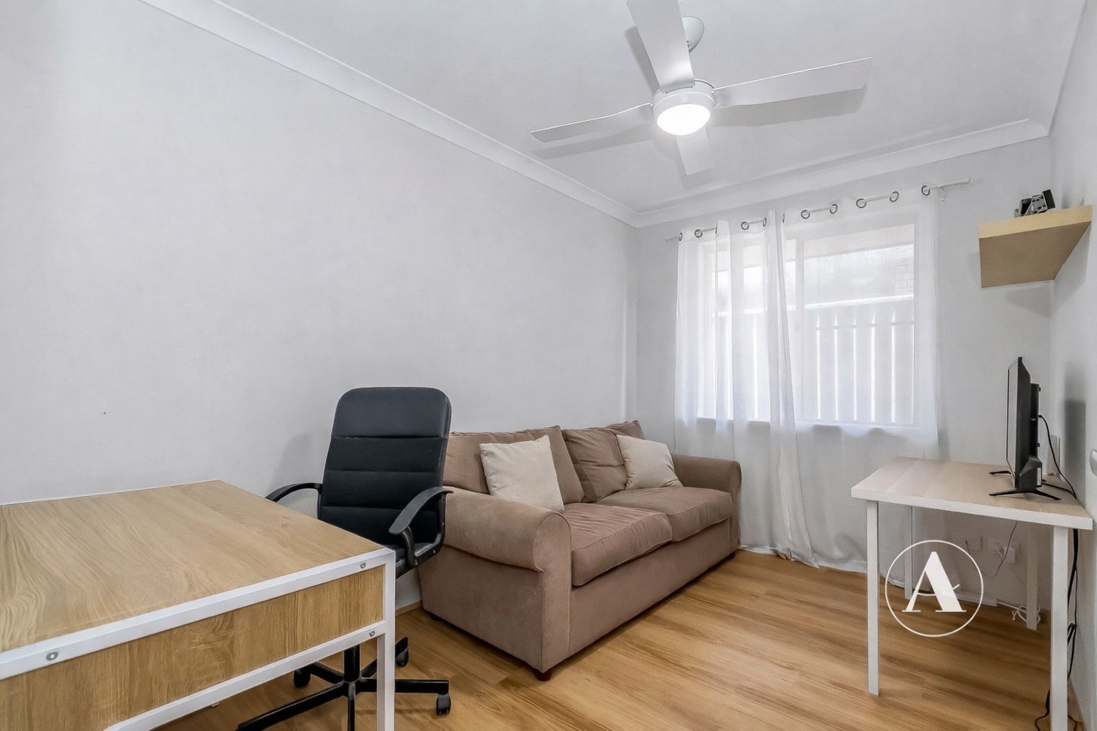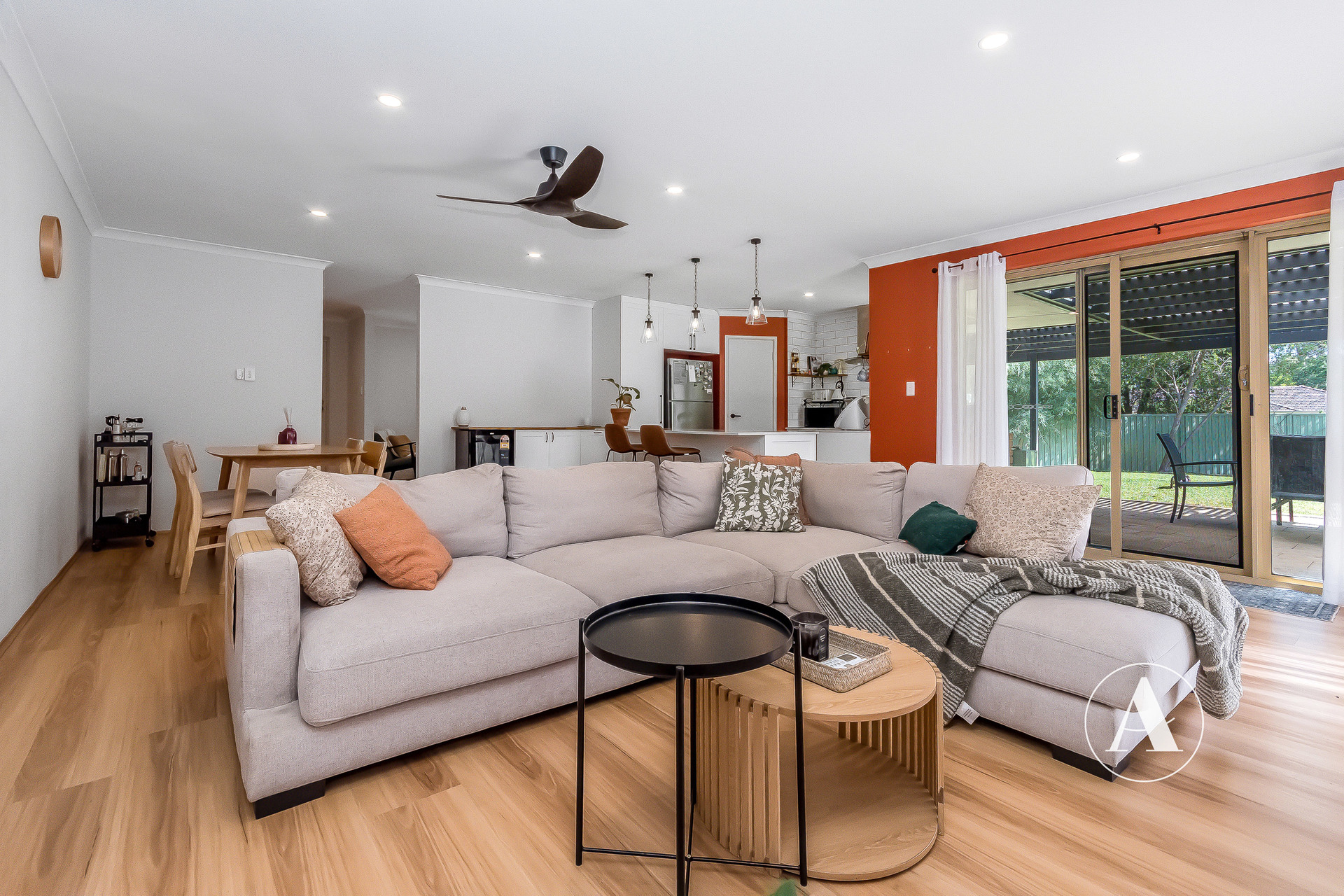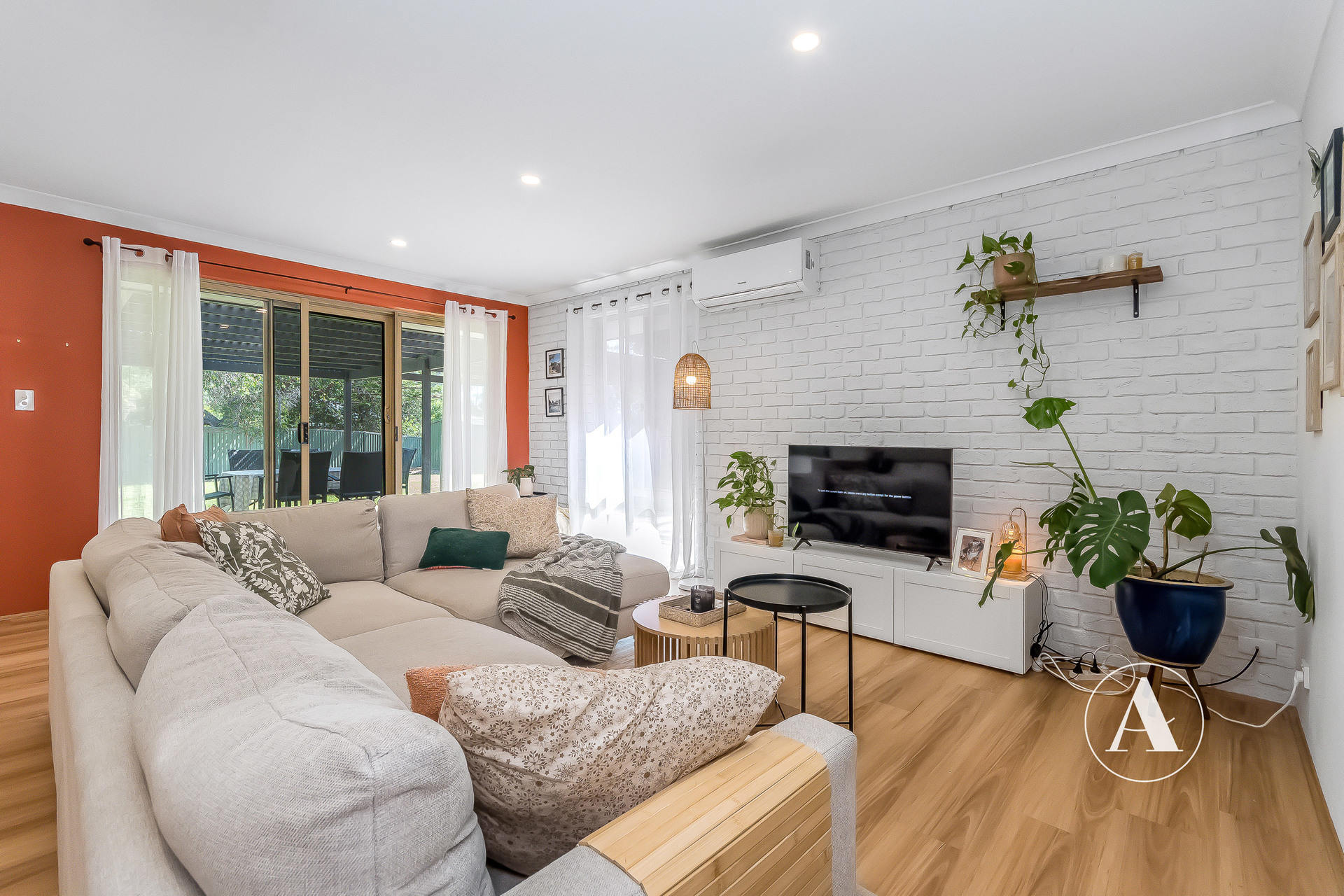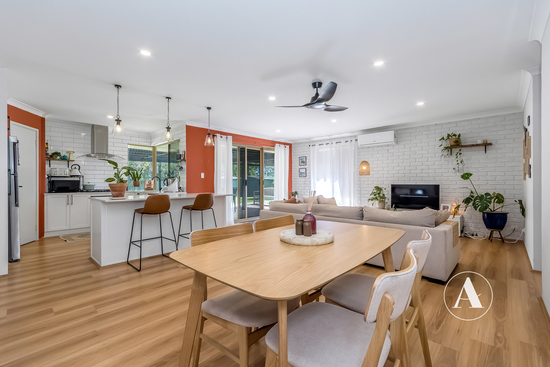 The open plan meals and dining area connects seamlessly with the kitchen and continues the wood flooring, enhanced by downlights, a feature brick wall, ceiling fan, Hisense split system and sheer curtains. Sliding doors with a security screen open out to the outdoor entertaining area, creating an easy indoor-outdoor flow.
