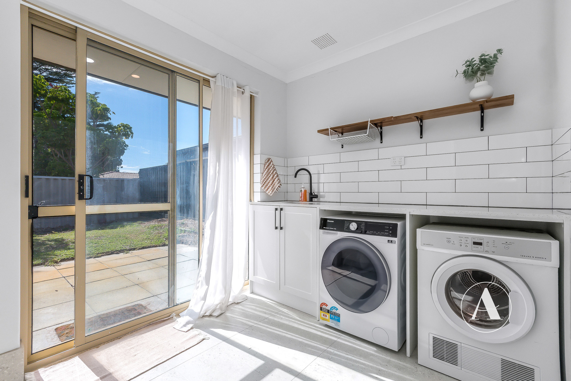 The tiled laundry provides excellent practicality with generous bench space, a trough, linen cupboards, subway tile splashback and downlights, along with sliding door access directly to the backyard.