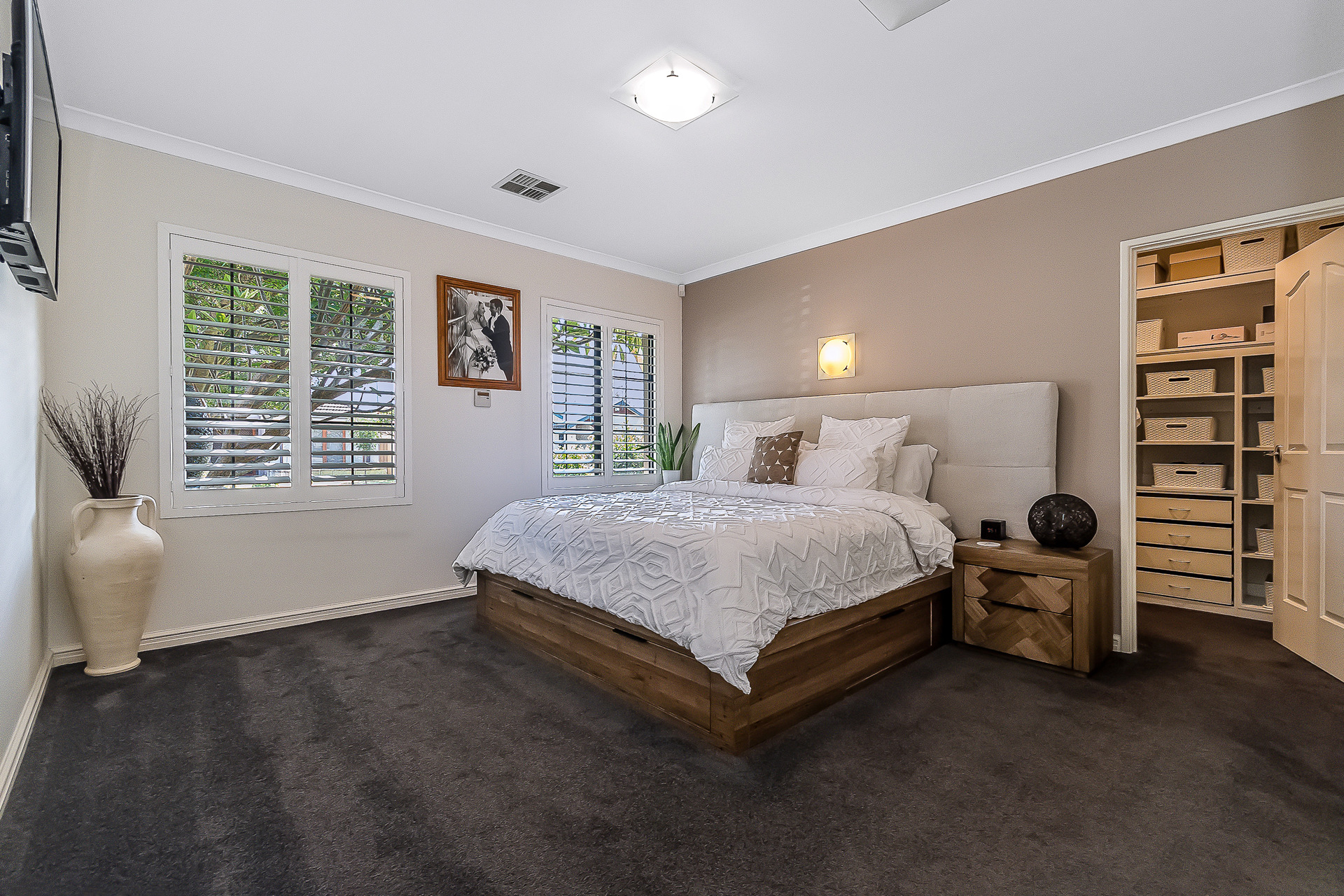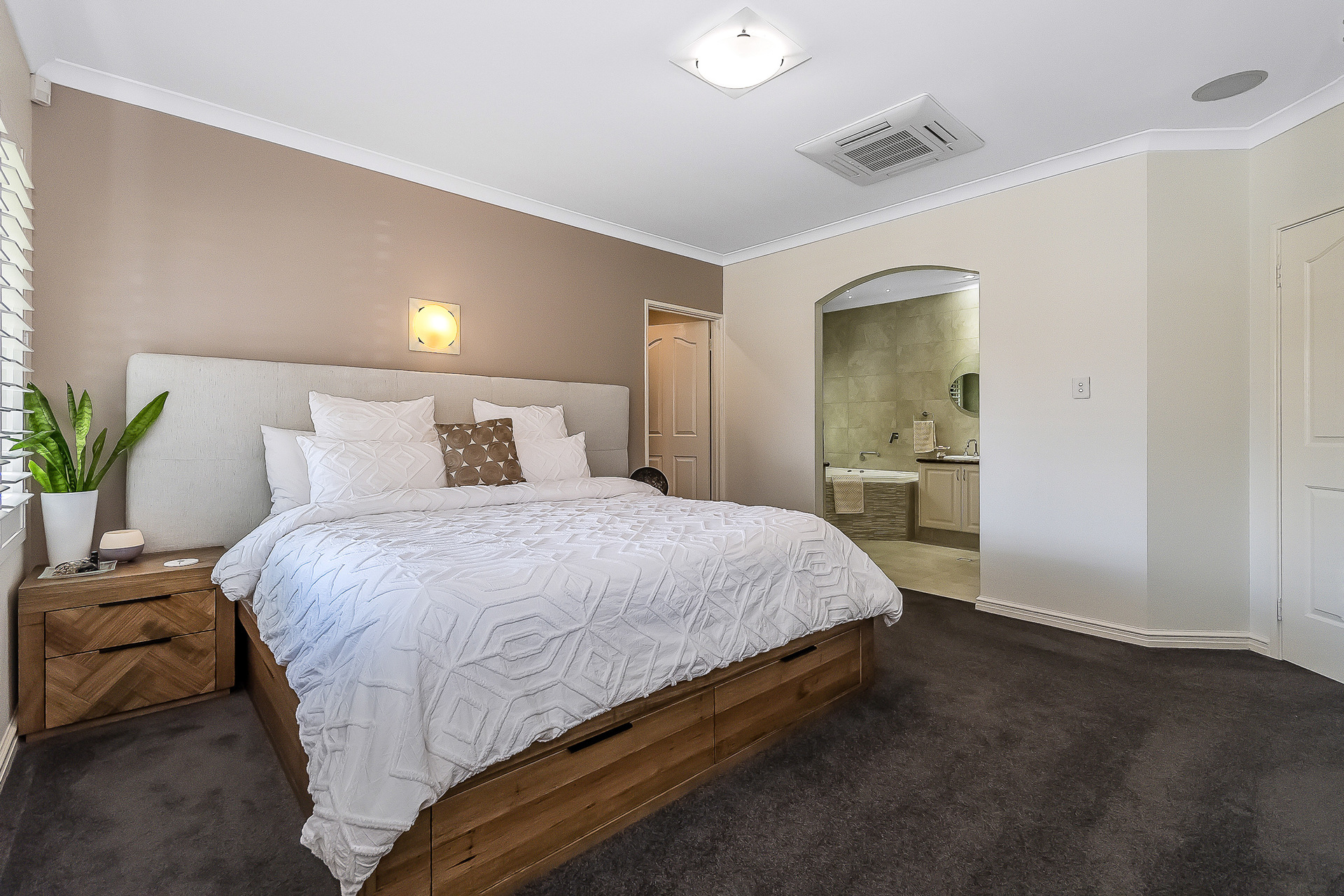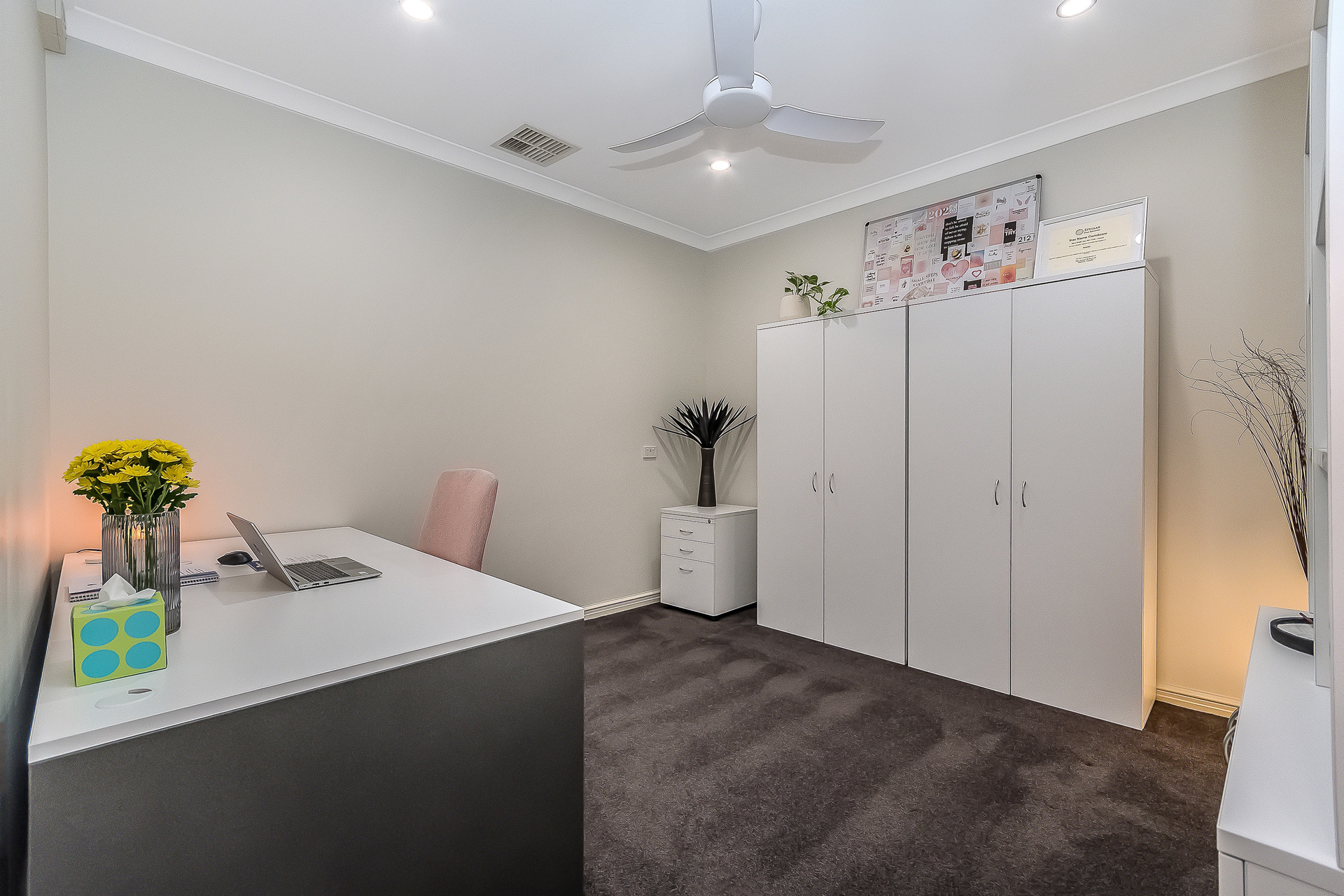 The “front-wing” of the property comprises of the main bedroom with ensuite and two separete independant rooms, currently utilised as a home office and work studio they offer the option for a parent’s retreat, formal loungeroom, nursery or dual office space. One visit and you will feel the level of comforat and detail that has gone into creating the home. Beautiful neutral tones contrast excpetionally against the greenery as the home welcomes you with a sense of style and tranquility.
