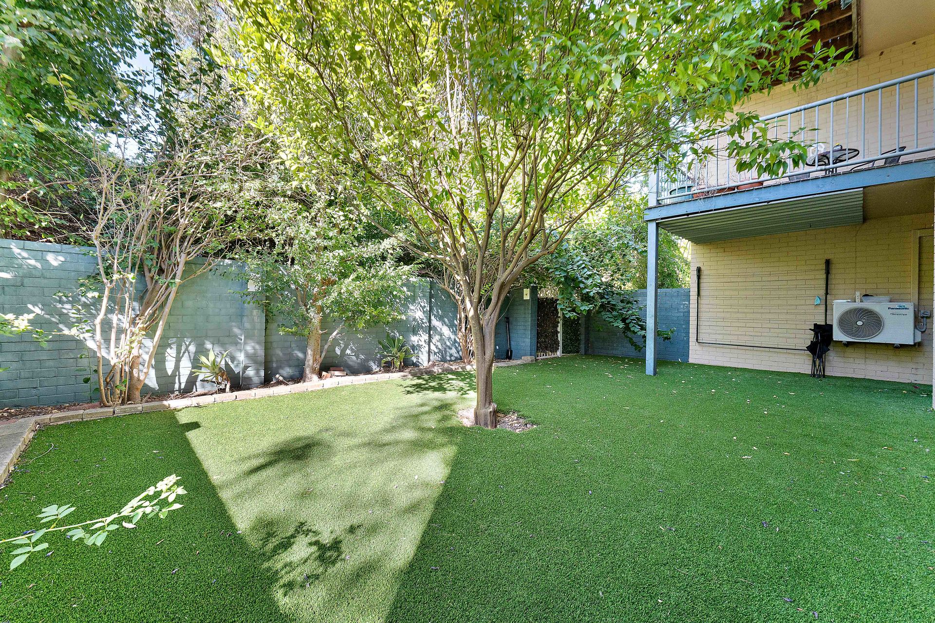 # Large private courtyard featuring established gardens and low-maintenance synthetic lawn – ideal for outdoor relaxing or entertaining.
