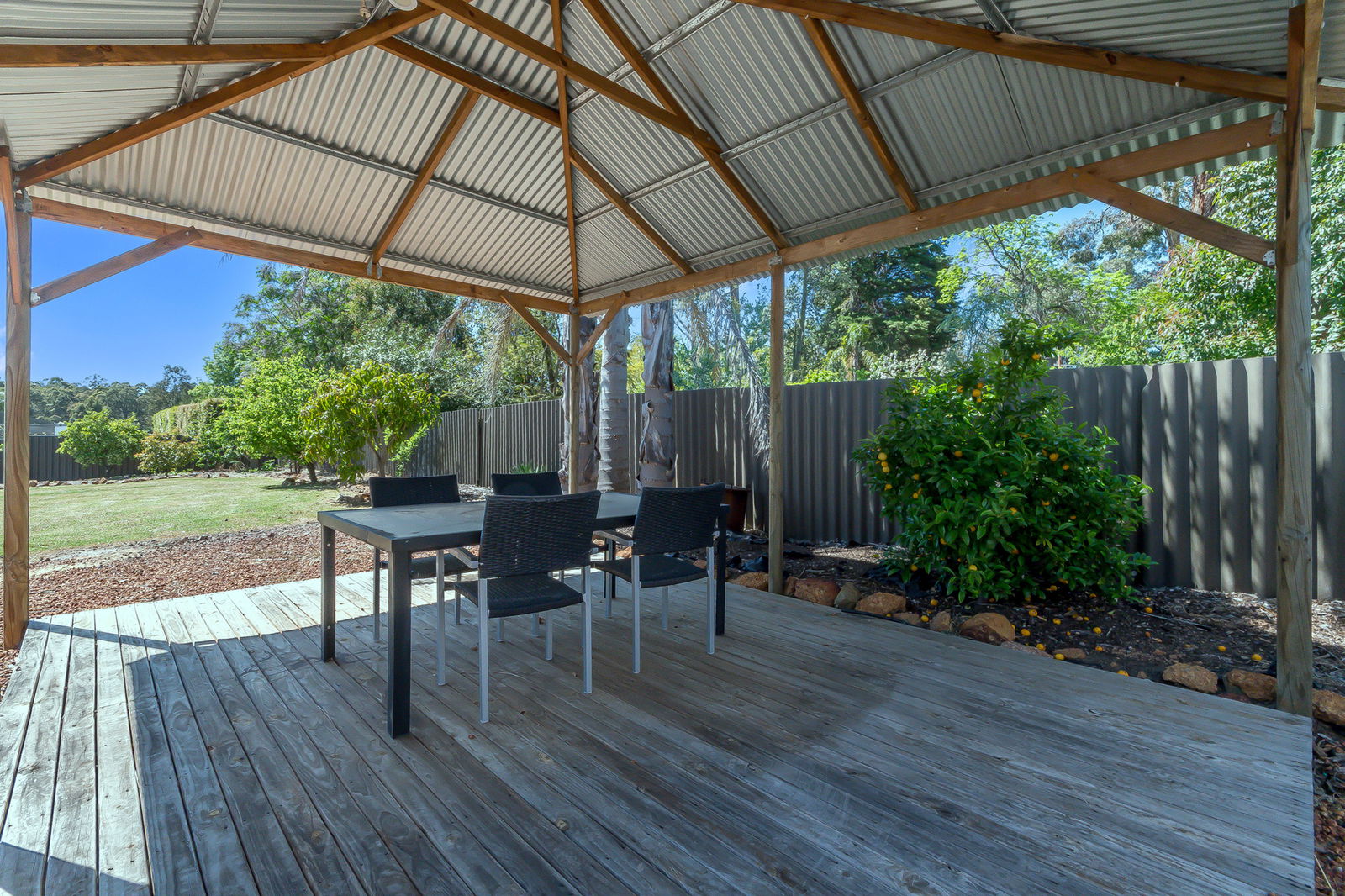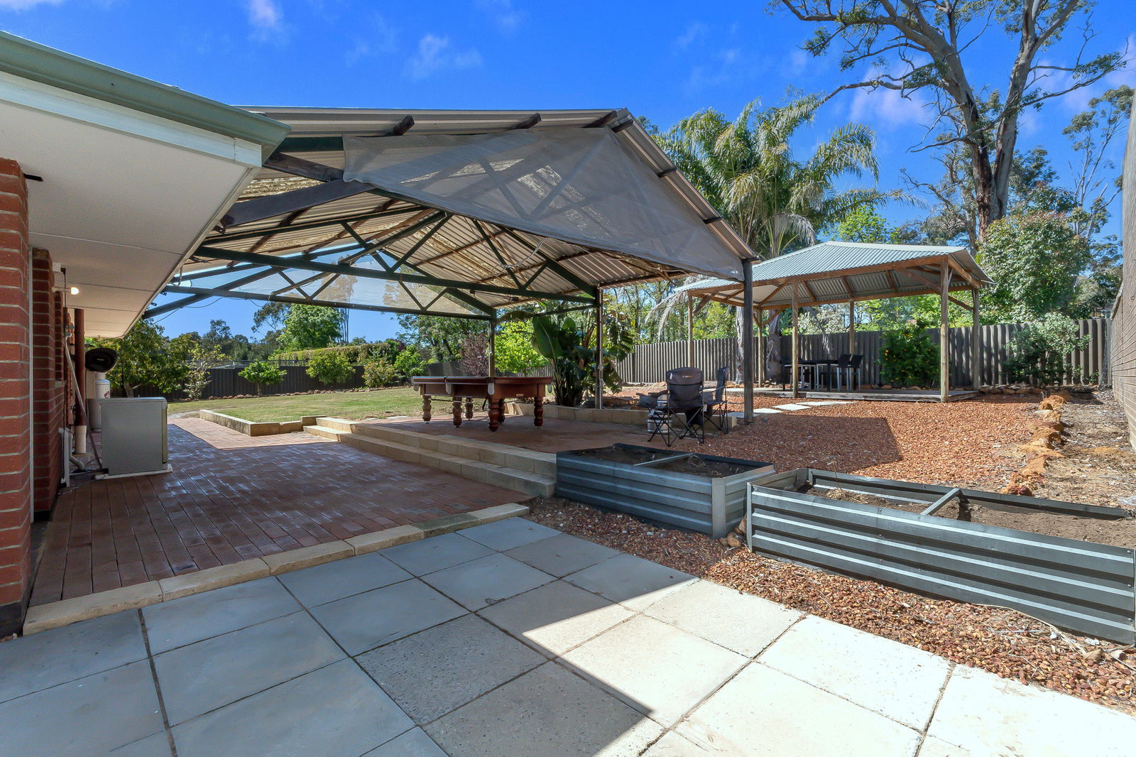 # Expansive outdoor entertaining areas including a high gable roof, level lawn, raised veggie beds, and gazebo