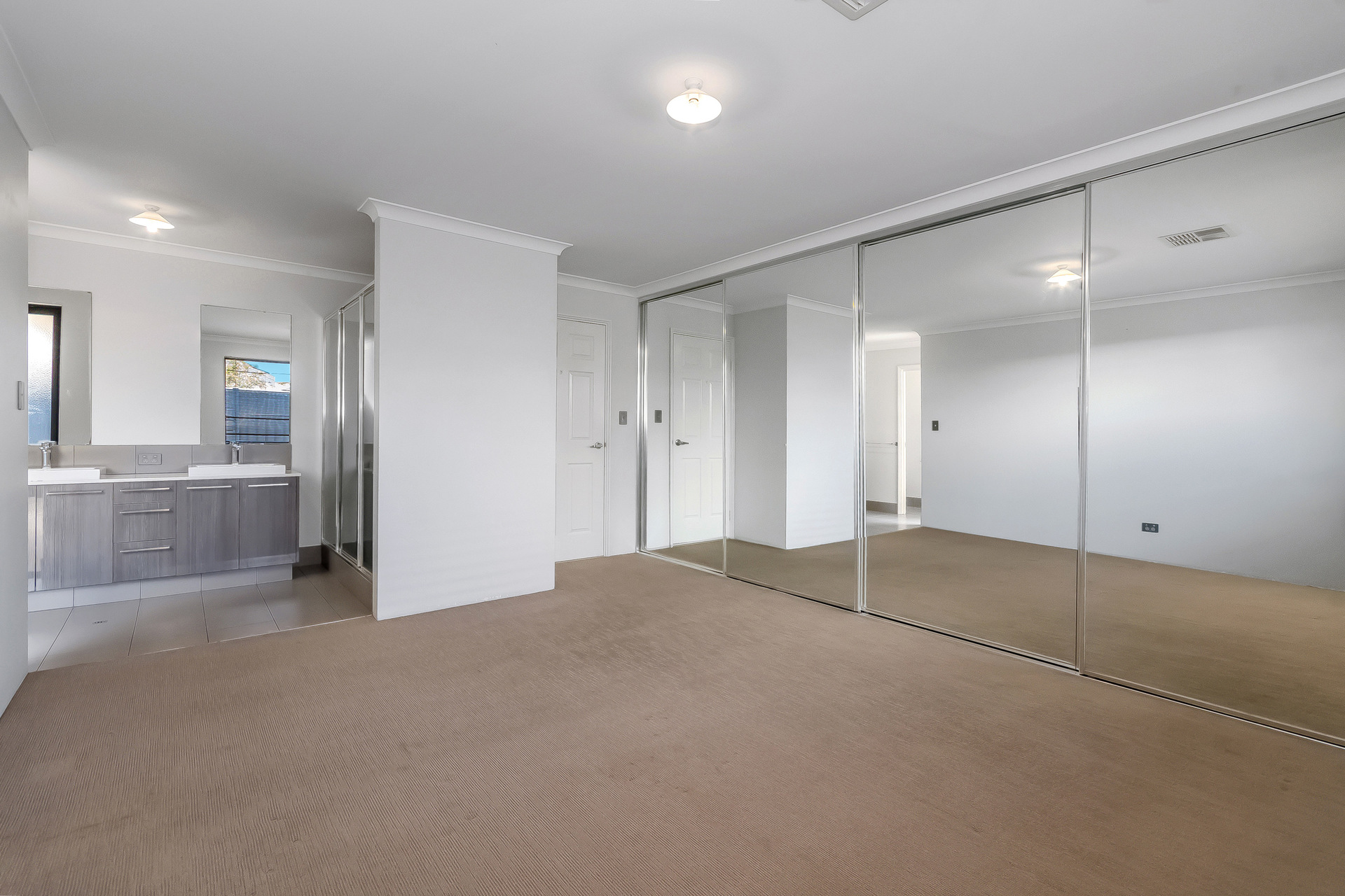 # Luxurious rear-positioned main bedroom featuring huge mirrored sliding door robes with abundant storage