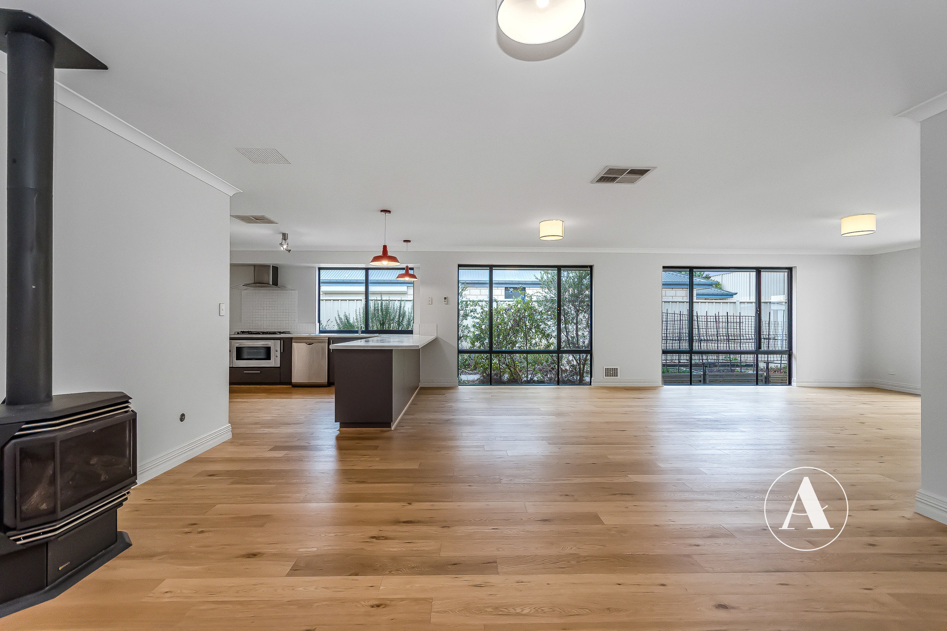 # Open plan main living and dining zone with fireplace – the heart of the home, offering warmth, space and connection for everyday living