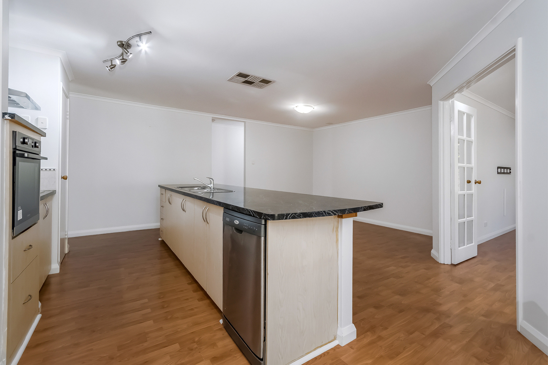 # Kitchen with generous benchtop space, front and rear cabinetry for ample storage, and a dishwasher included