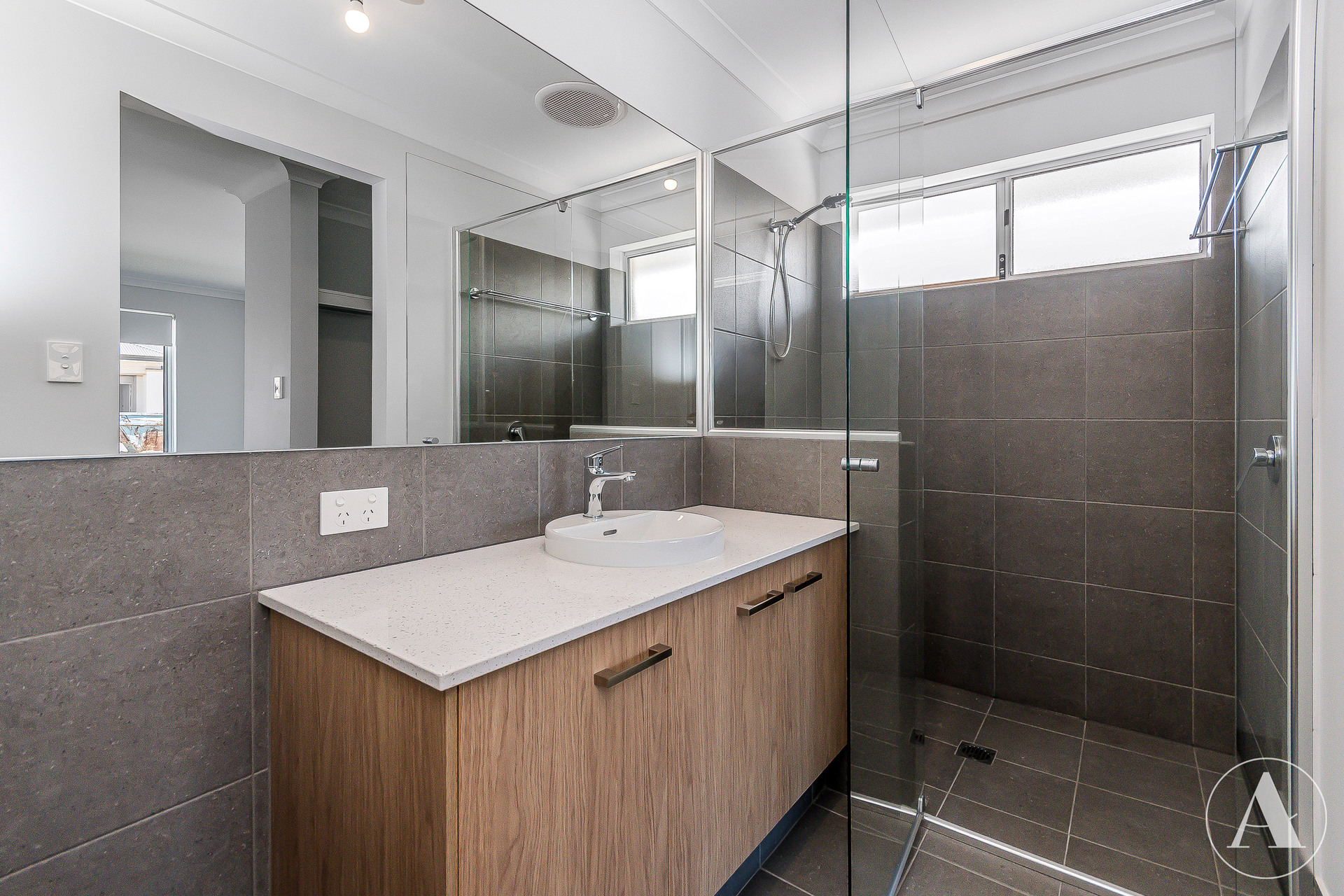 # Two stylish bathrooms, including a sleek ensuite with stone benchtop, basin & storage