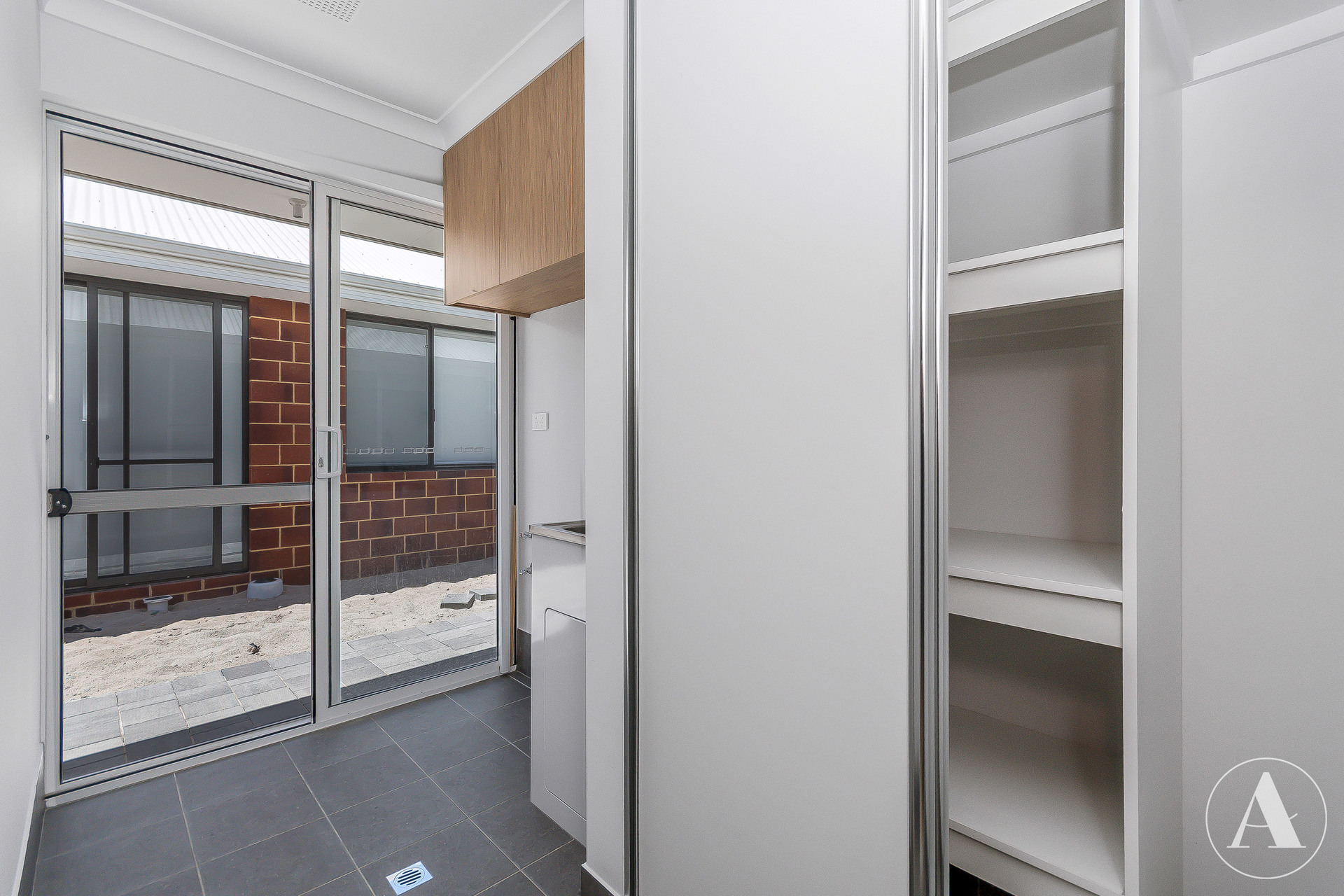 # Laundry features overhead cupboard above the laundry trough and enclosed linen