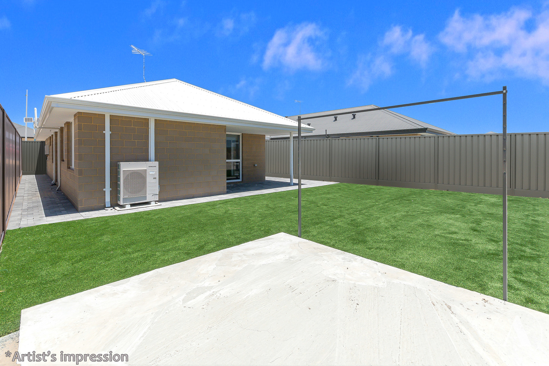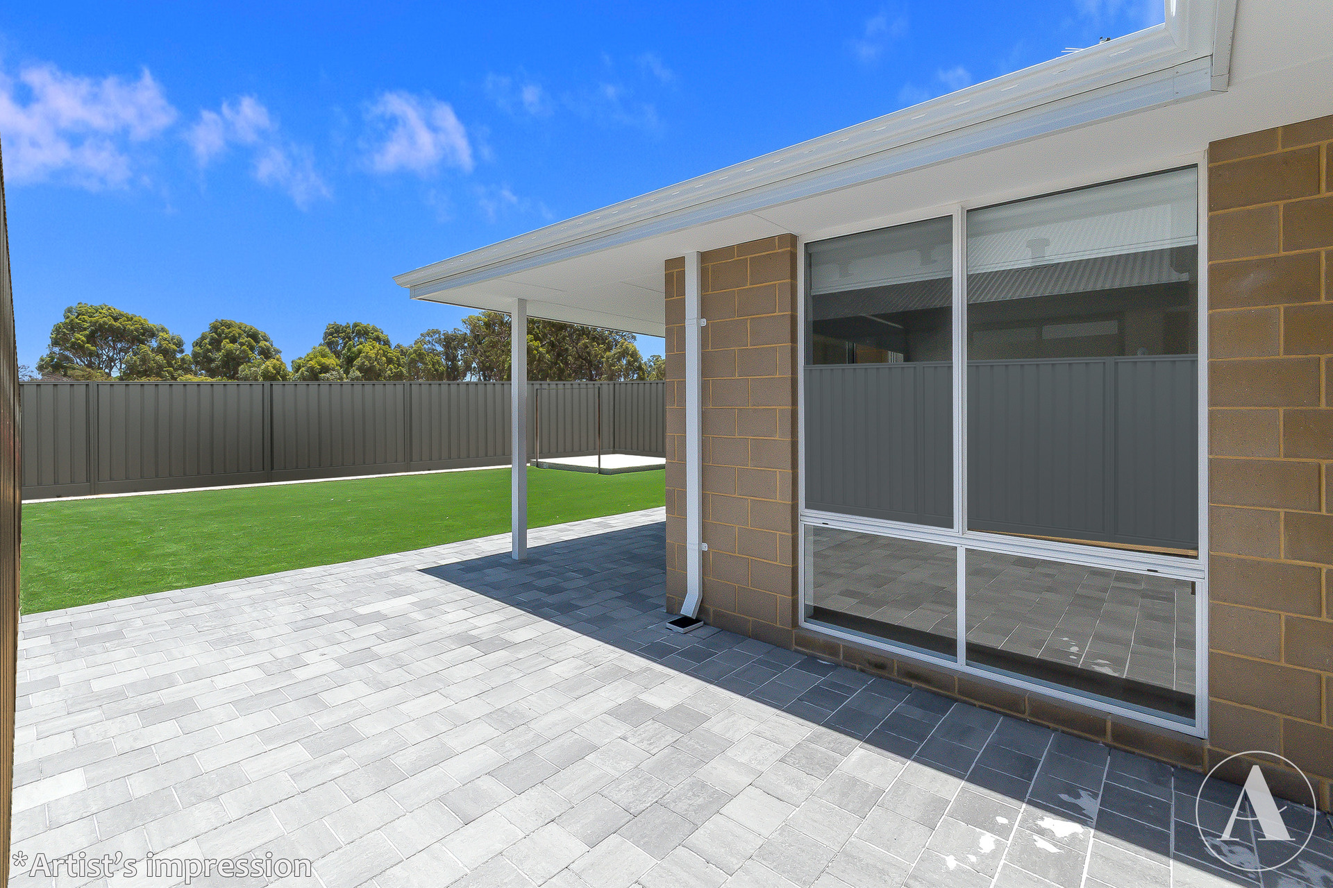 # Impressive low-maintenance backyard with artificial turf and paving, ideal for entertaining or enjoying a morning coffee
