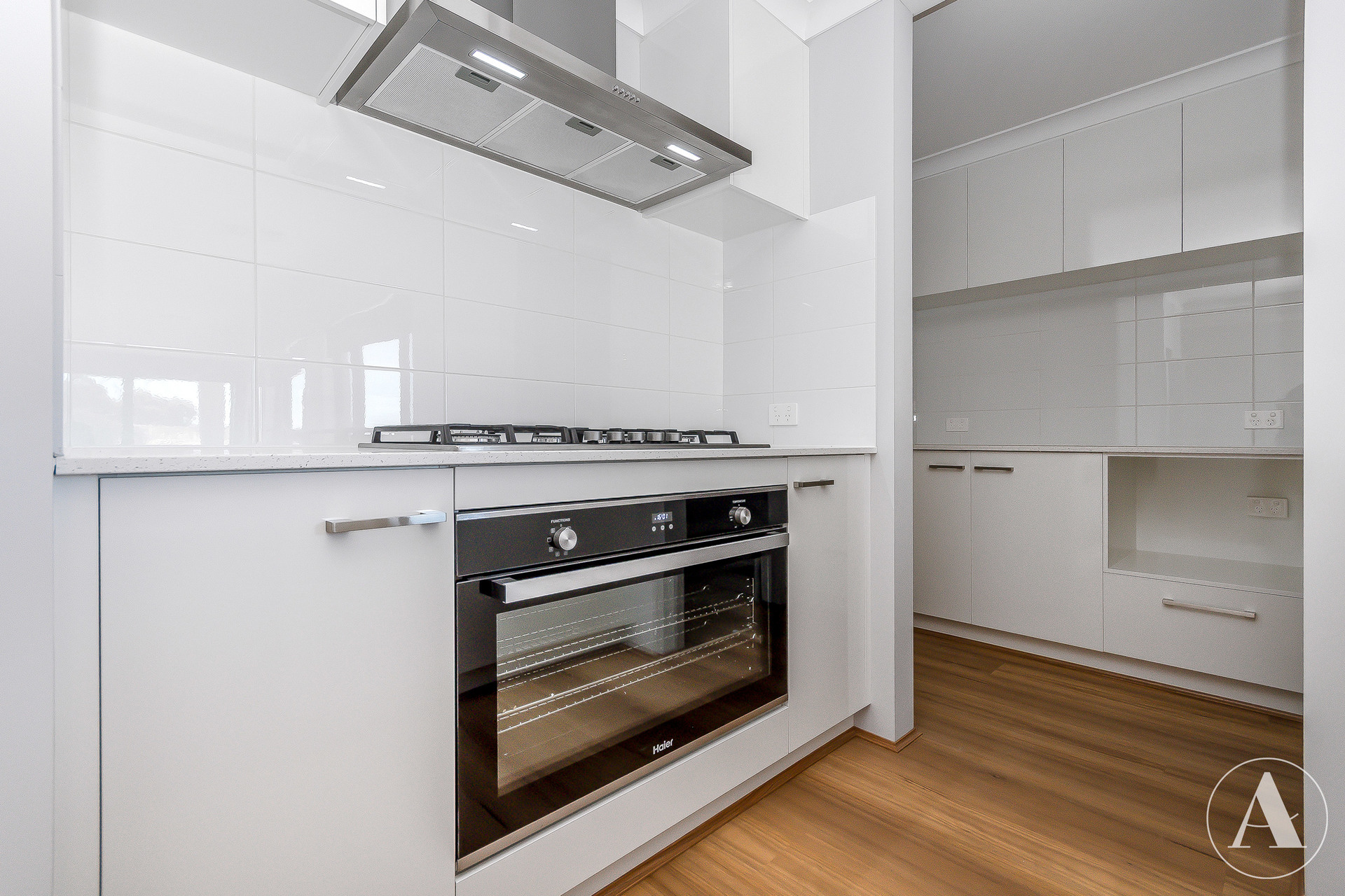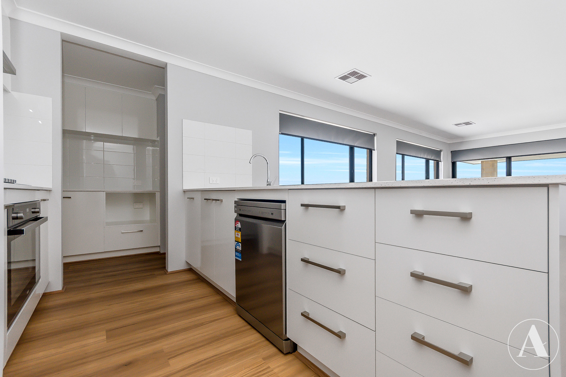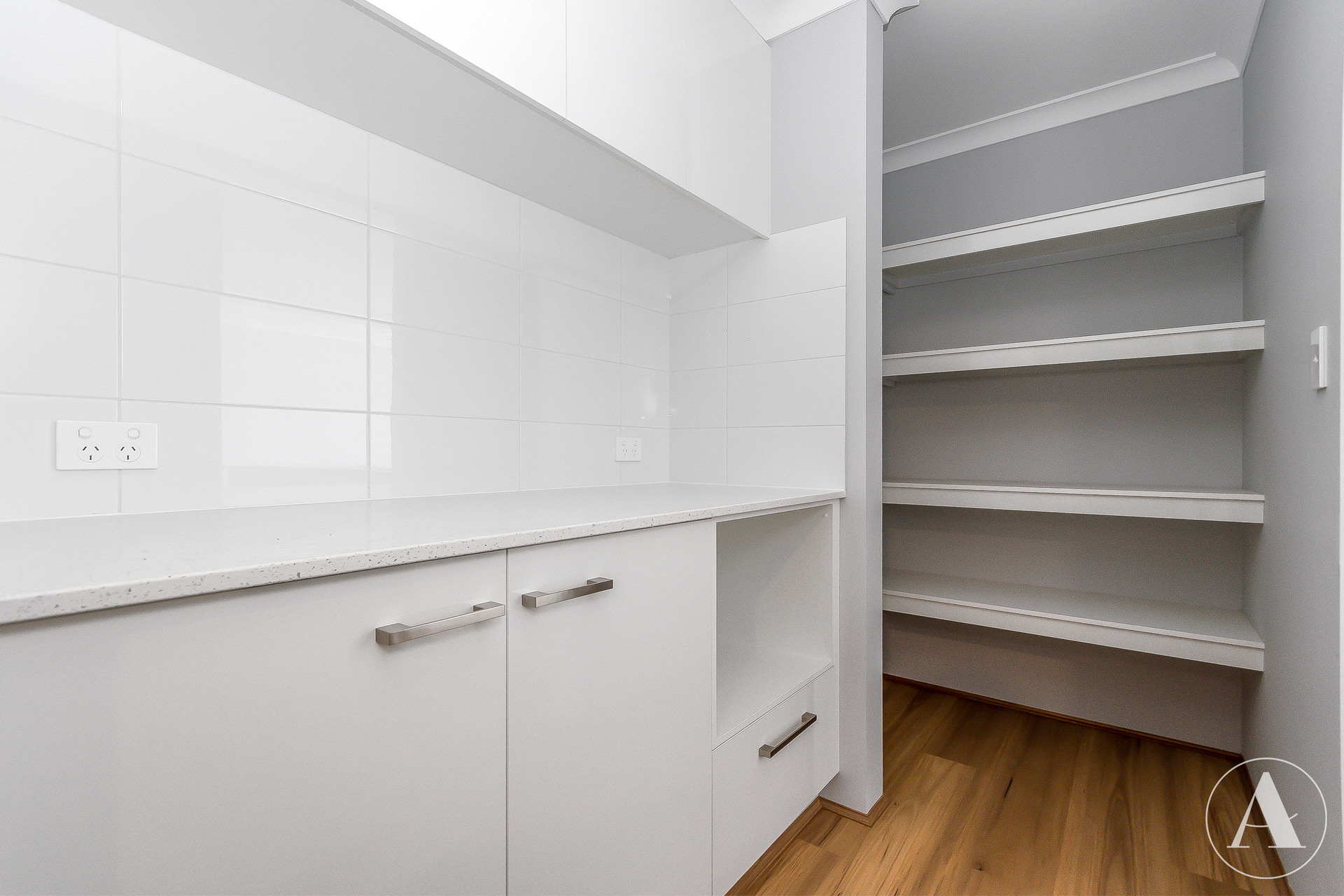 # Kitchen with stone benchtops, stainless steel appliances, dishwasher, ample storage, and a scullery area featuring extra overhead cupboards, stone benchtops, microwave recess, direct access to the garage, plus a separate pantry
