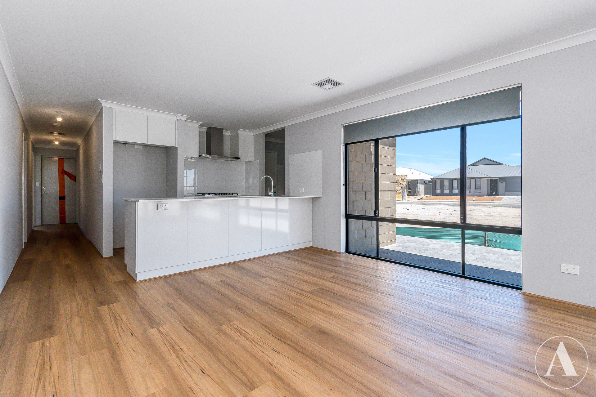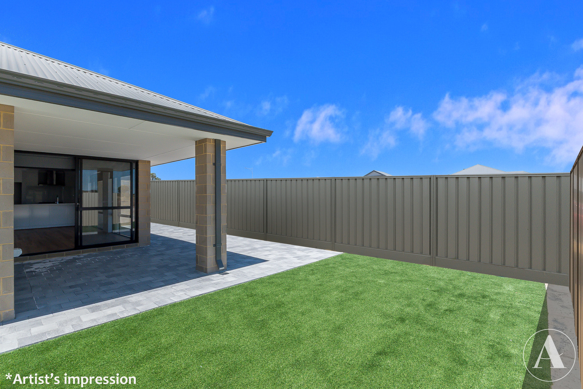 # Sliding doors opening to alfresco area overlooking a low-maintenance backyard with paving and artificial turf