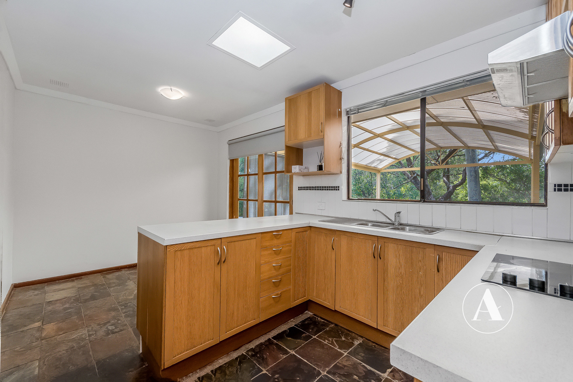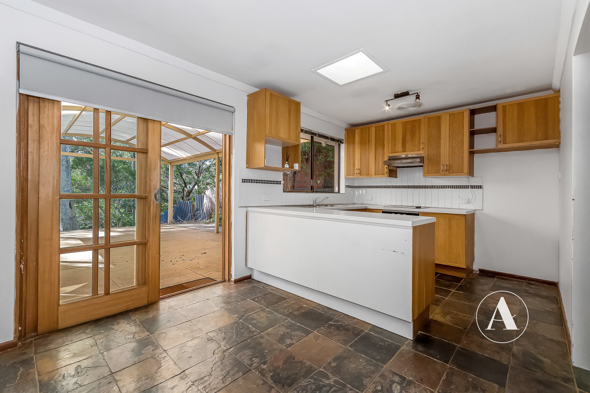 # Updated kitchen with excellent storage, seamlessly connecting to the outdoors through charming French doors