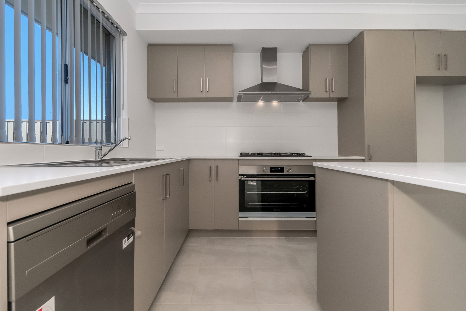 # Modern kitchen with stainless steel appliances, dishwasher, overhead cupboards, and plenty of storage